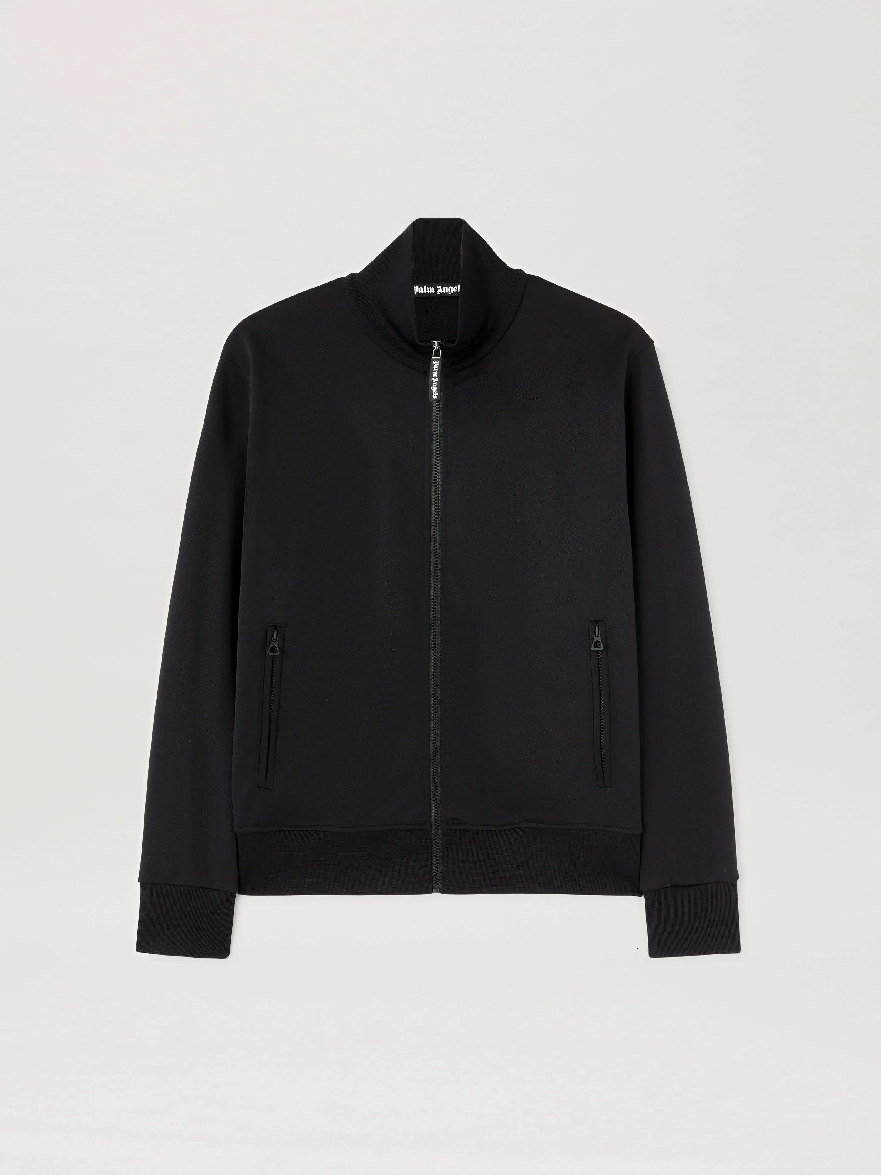 Palm Angels is a state of mind, the tracksuit its dailywear. Men's black Track jacket with stand-up collar, logo-embossed zipper pull, and Curved Palm Angels logo printed in white on the back. SALAH WEARS SIZE M HEIGHT: 6' 0” (183 CM) BUST: 37.5” (95 CM) WAIST: 30” (76 CM) HIPS: 36” (91 CM) PRODUCT ID: PMBD089S25FAB0011003