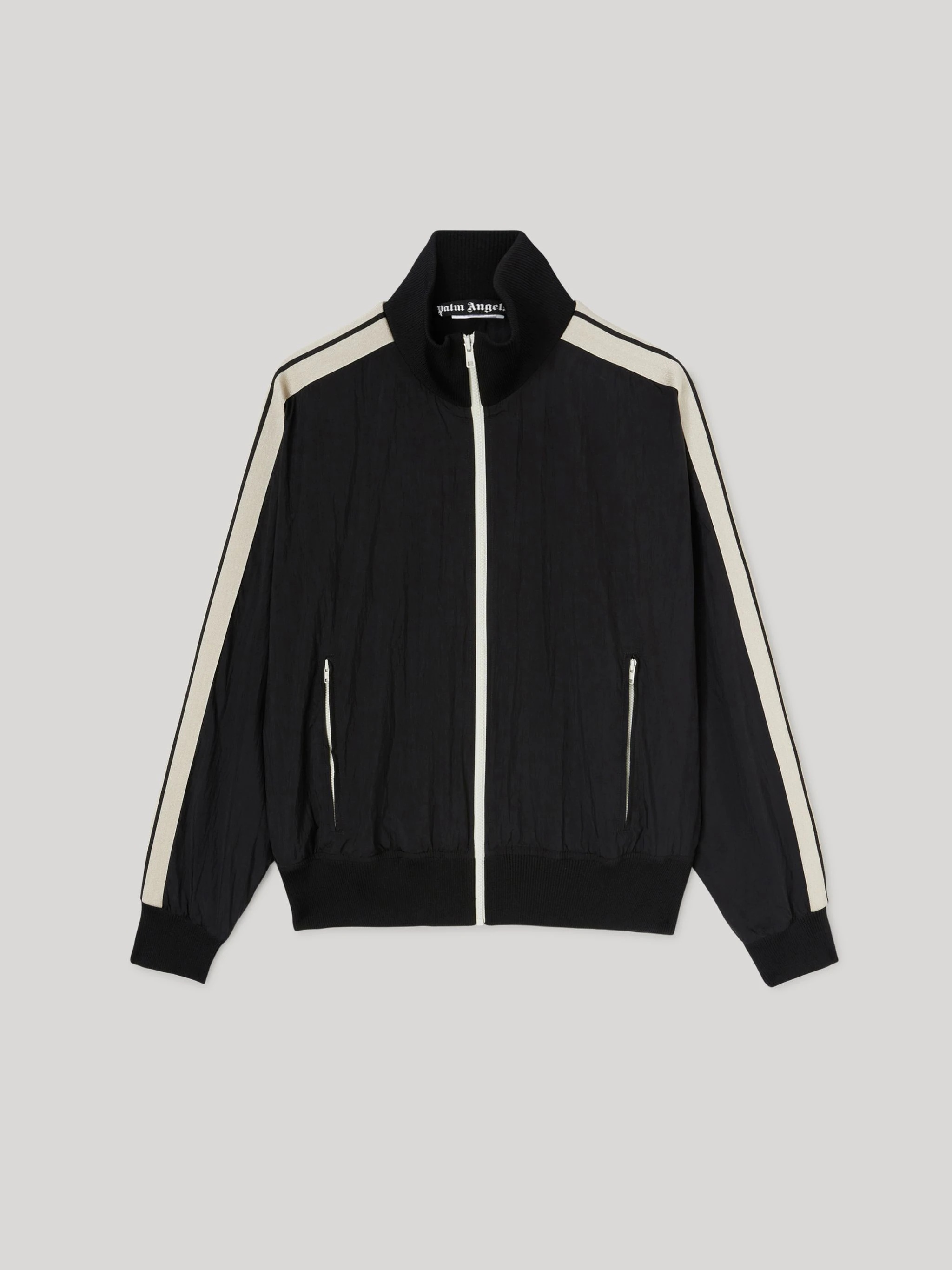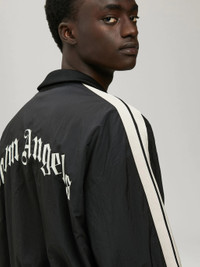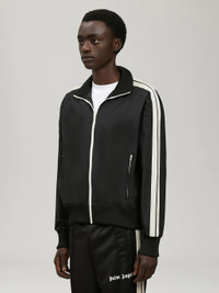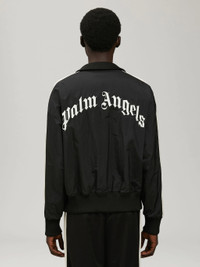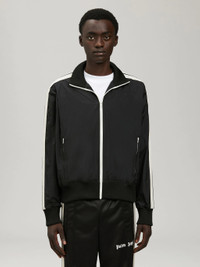 LONG SLEEVES TRACK JACKET IN BLACK. "PALM ANGELS" WHITE CURVED LOGO PRINTED ON CHEST AND TO THE REAR. RIB KNIT CUFFS, COLLAR AND HEM. ZIP CLOSURE. TWO ZIP POCKETS. WHITE STRIPES AT SIDE. FABRIC 100% POLYAMIDE MODEL MASSAER WEARS SIZE M HEIGHT: 6'1 (185 CM) CHEST: 31" (80 CM) WAIST: 24" (62 CM) HIPS: 34" (86 CM) PRODUCT ID: PMBD030C99FAB0011001