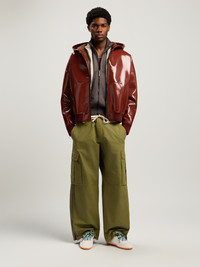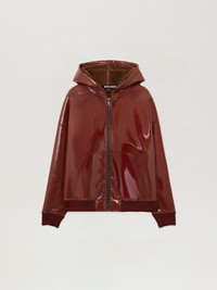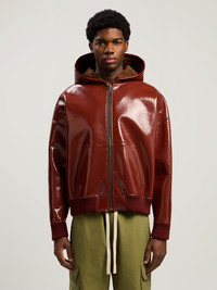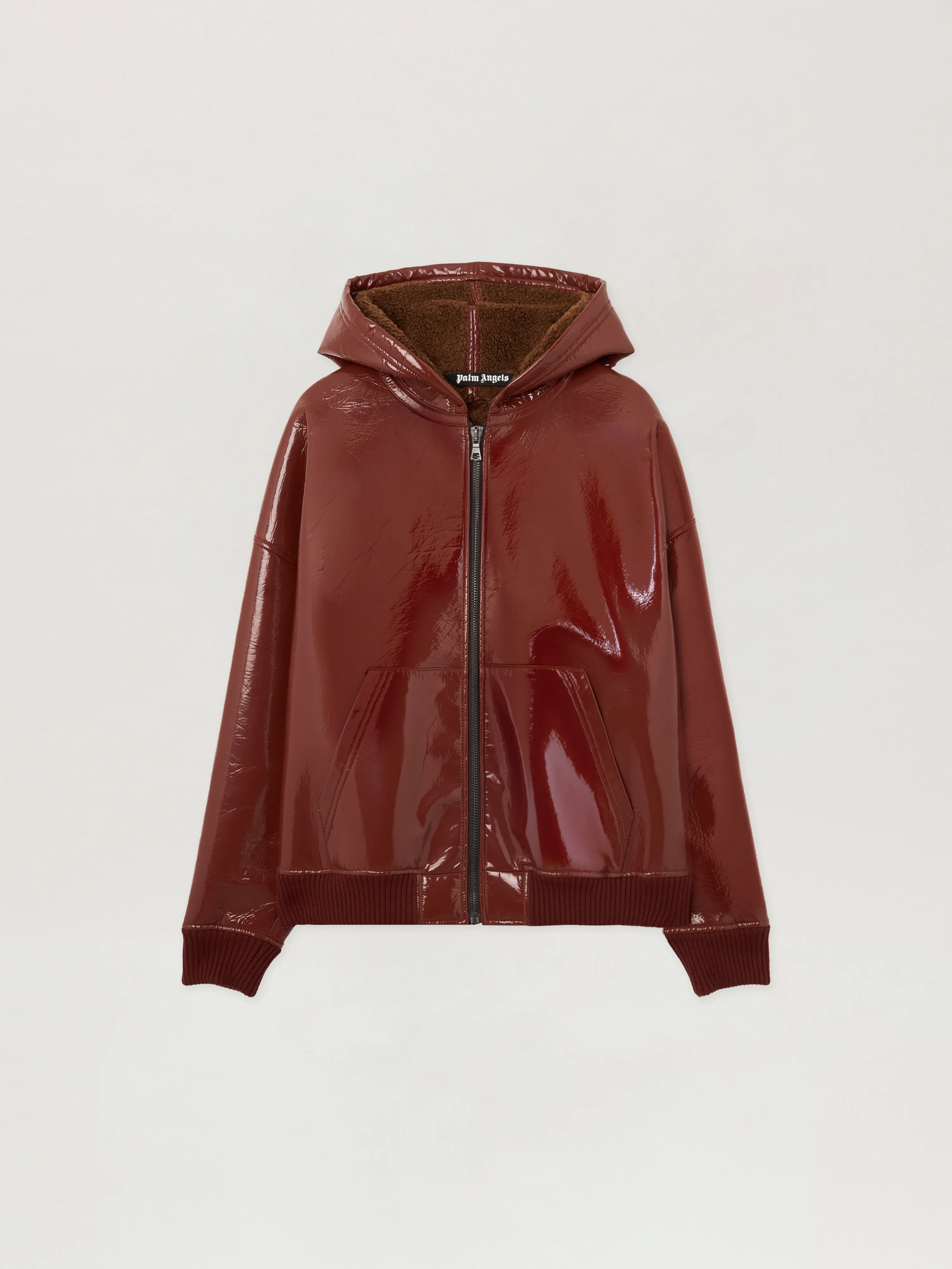 Elevate your streetwear collection with this distinct vinyl bomber jacket, featuring a curved logo design, perfect for adding a touch of rebellious sophistication to any ensemble. - Sleek vinyl construction for a glossy finish - Curved logo design on the front - Ribbed cuffs and hem for a snug fit - Front zip closure for easy wear - Two front pockets for functionality - Attached hood for added versatility - Interior lining for comfort and warmth DETAILS - 100% Leather, Embroidery: 100% Polyester, Fabric: 100% Polyester, Lining: 100% Cotton, 100% Polyurethane - Code: PMEH03AF25FAB0012727