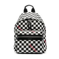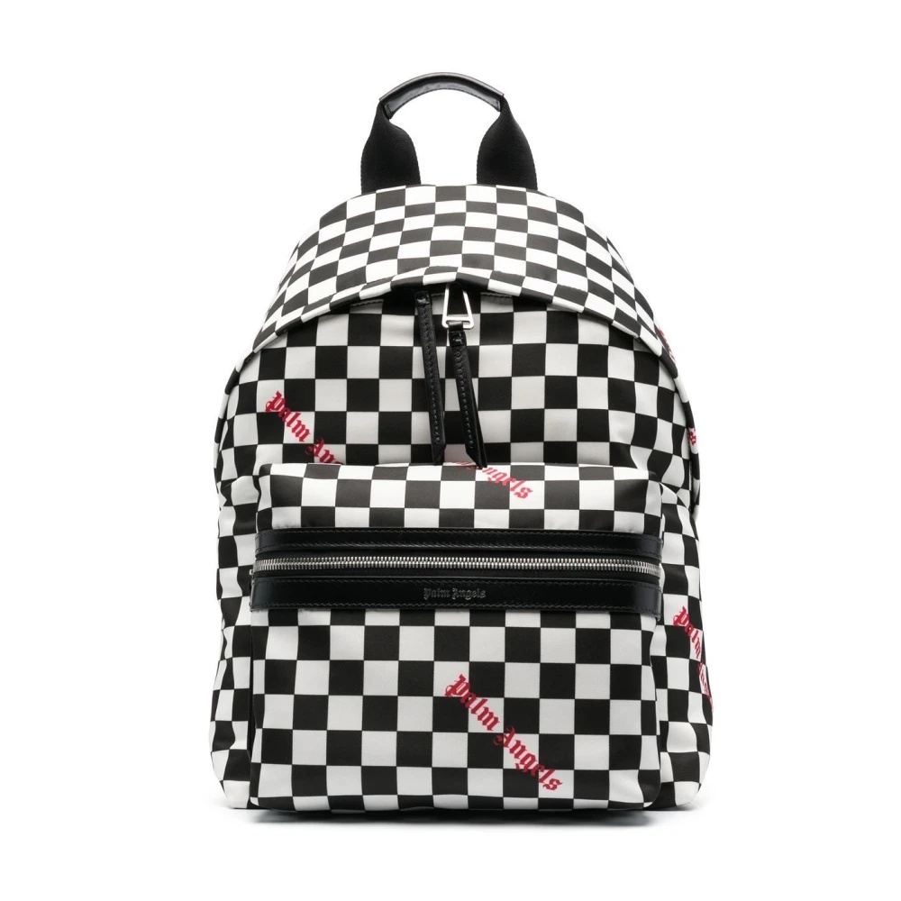 BACKPACK IN BLACK AND WHITE TECHNICAL FABRIC WITH DAMIER GRAPHIC PRINTED ALL OVER. RED "PALM ANGELS" LOGO PRINTED ALL OVER. TOP HANDLE. ZIP CLOSURE AND ZIPPED POCKET AT FRONT. FABRIC 100% POLYESTER - FABRIC 1 100% LEATHER CALF - LINING 100% COTTON LENGTH: 11" (28 CM) HEIGHT: 15.7" (40 CM) DEPTH: 9.2" (23,5 CM) PRODUCT ID: PMNB015F22LEA0011001
