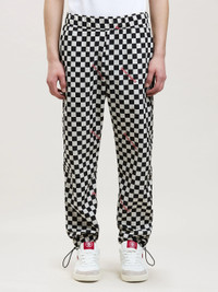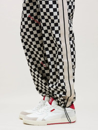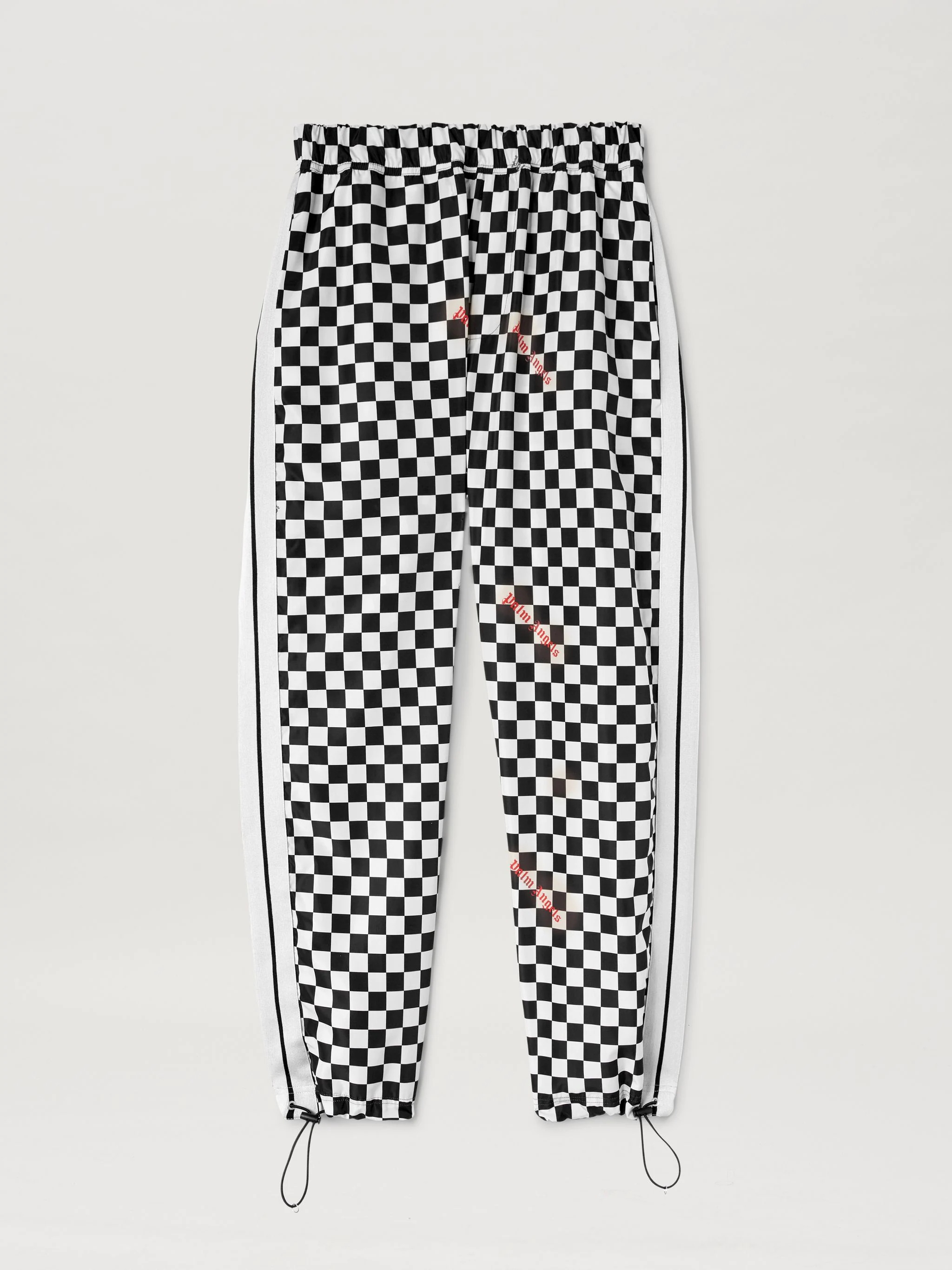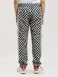 LONG AFTERSPORTS TRACK PANTS IN BLACK AND WHITE TECHNICAL FABRIC WITH DAMIER GRAPHIC PRINTED ALL OVER. RED "PALM ANGELS" LOGO PRINTED ALL OVER. TWO-POCKET STYLING. ELASTICIZED WAISTBAND AND WHITE STRIPES AT SIDE. COULISSE CLOSURE AT ANKLE CUFFS. REGULAR FIT. FABRIC 100% POLYESTER - DETAIL 100% POLYESTER MODEL RAYAN WEARS SIZE M HEIGHT: 5’11" (181 CM) CHEST: 32” (82 CM) WAIST: 27” (68 CM) HIPS: 36” (92 CM) PRODUCT ID: PMCA051F22FAB0031025