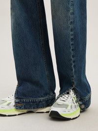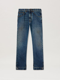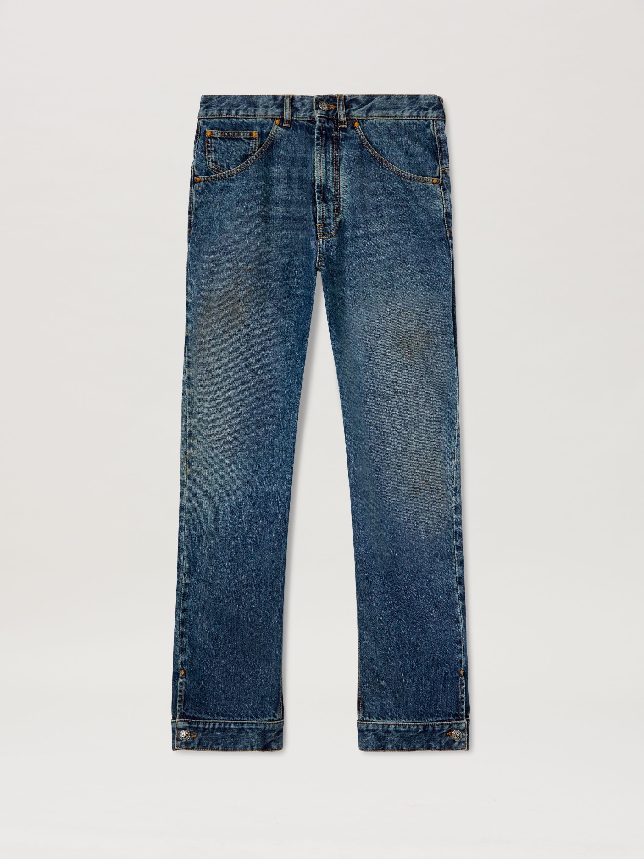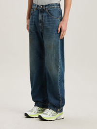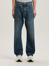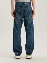 Functionality expressing its style potential. Men's denim work pants with dark brushes and front slit and denim back strap. PRODUCT ID: PMYA048S25DEN0014540