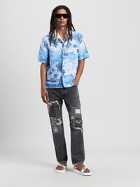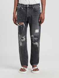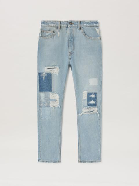Radical and practical, for a stand out outfit. Men's faded-black denim five-pocket with rips and patches on the front and back and with embroidered Palm Angels logo on the back pocket. Mohamed wears size M Height: 6' 1"" (185 cm) Bust: 34"" (86 cm) Waist: 28"" (71 cm) Hips: 37"" (94 cm) PRODUCT ID: PMYA039S24DEN0021003