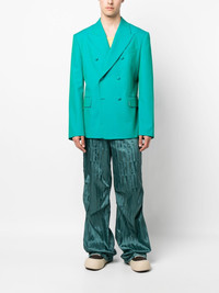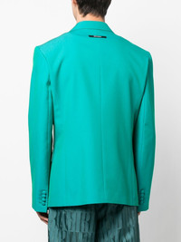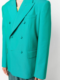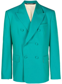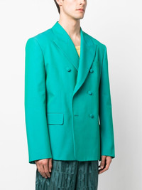 double-breasted blazer A departure from the brand's sportswear aesthetic, Palm Angels' blazer showcases the label's tailoring expertise. Crafted in a double-breasted silhouette with notched lapels that nod to classic designs, it's punctuated with a vibrant turquoise hue. Highlights - Turquoise blue-green - Cotton - Decorative button detailing - Notched collar - Notched lapels - Long sleeves - Buttoned cuffs - Double-breasted button fastening - Chest welt pocket - Two side flap pockets Made in Italy Composition Lining: Cupro 100%, Cotton 100% Outer: Cotton 70%, Polyester 30% SIZE & FIT Model measurements Height 6 ft 1 in(1.86 m) Bust/Chest 37.4 in(95 cm) Hips 34.64 in(88 cm) Waist 29.13 in(74 cm) FittingInformation Designed for a slim fit, offering a comfortable fit that sits just away from the body Made from a midweight non-stretch fabric, this piece offers minimal elasticity when worn This piece fits true to size – take your usual size Washing instructions Dry Clean Only