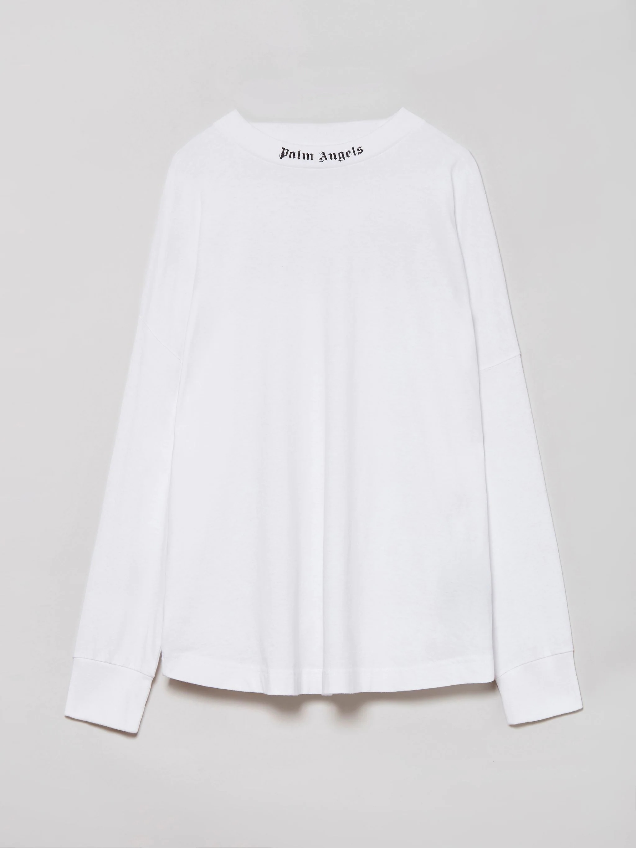 Long sleeves t-shirt in white with "Palm Angels" logo printed at collar. "Palm Angels" doubled logo printed in fuchsia at back. Crewneck collar. Loose fit. Print executed on finished garment. This particular procedure makes each garment looks different, the print is irregular, especially near thicker areas where there may be fragmentation or colour build up. These distinguishing features are an effect that make this garment unique and are not to be considered flaws. These aspects may change with garment use and handling. Model Thiam wears size M Height: 73.5" (187 cm) Chest: 35" (88 cm) Waist: 27" (70 cm) Hips: 35" (88 cm) PRODUCT ID: PMAB001S21JER0010132