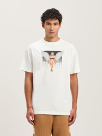 A unique original print inspired by vintage pin-ups, hybridized with elements from Palm Angels' world. Men's white short-sleeved T-shirt with image of pin up with angel's wings and Palm Angels logo printed in white. DETAILS - Salah Wears Size Height: 6' 0” (183 Cm) Bust: 37.5” (95 Cm) Waist: 30” (76 Cm) Hips: 36” (91 Cm) Fabric 100% CottonRib Detail 100% Cotton - Code: PMAA001S25JER00A0310