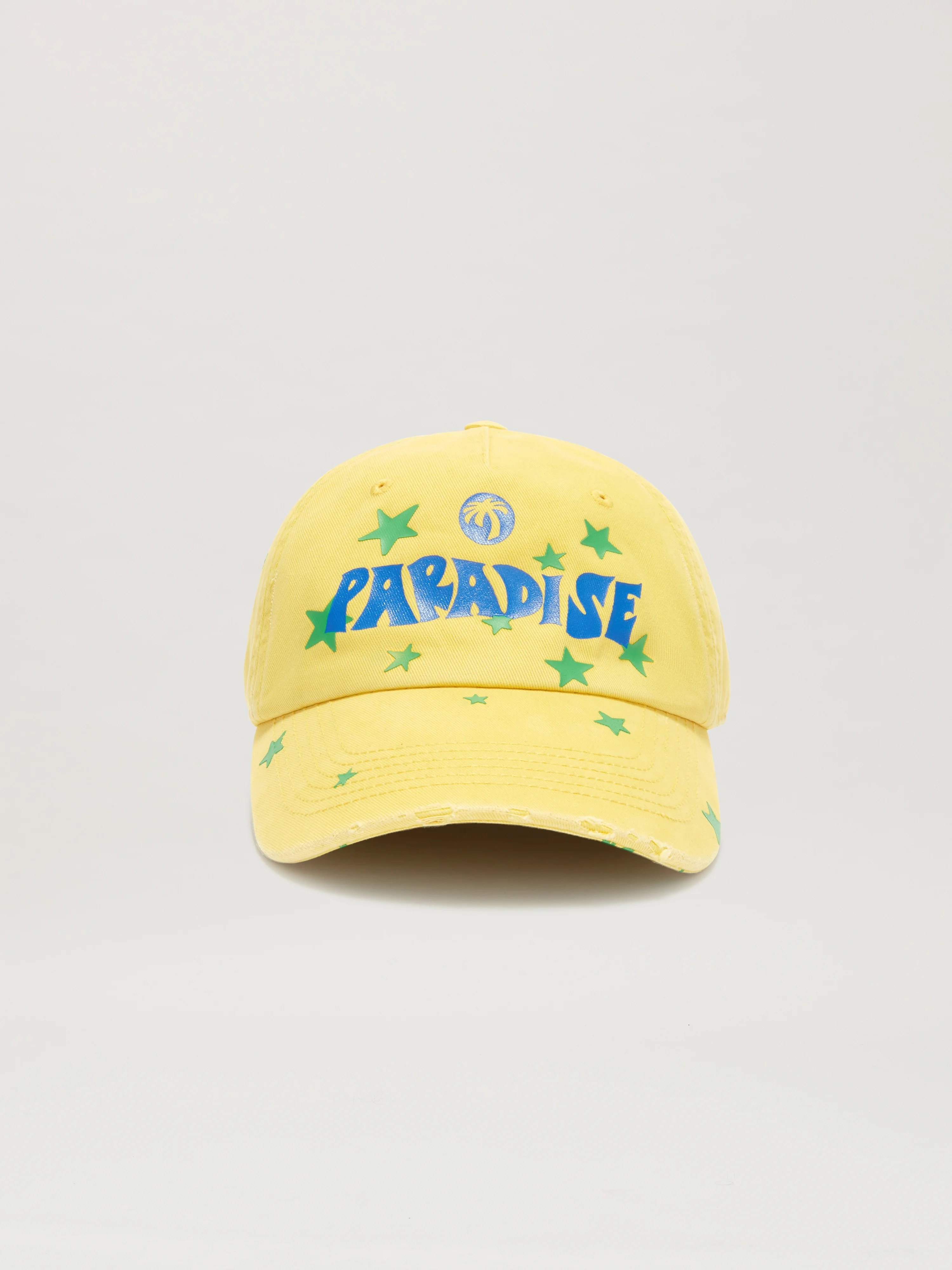 Tropical graphics, glitter details, 3D effects: one of the exclusive prints of SS25. Men's yellow baseball cap with Paradise lettering printed in blue with blue Oval Palm on top, glittering green stars printed front and back and logo Palm Angels embroidered in blue on the back. DETAILS - Embroidery 100% PolyesterFabric 100% CottonLining 100% Cotton - Code: PMLB108S25FAB0031845