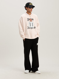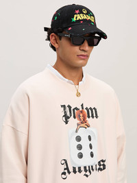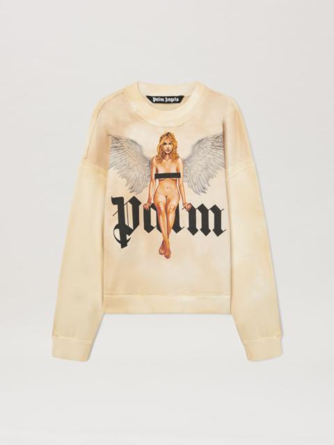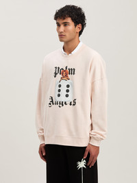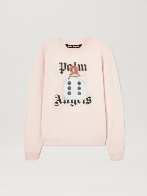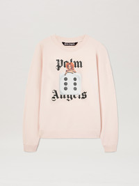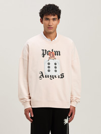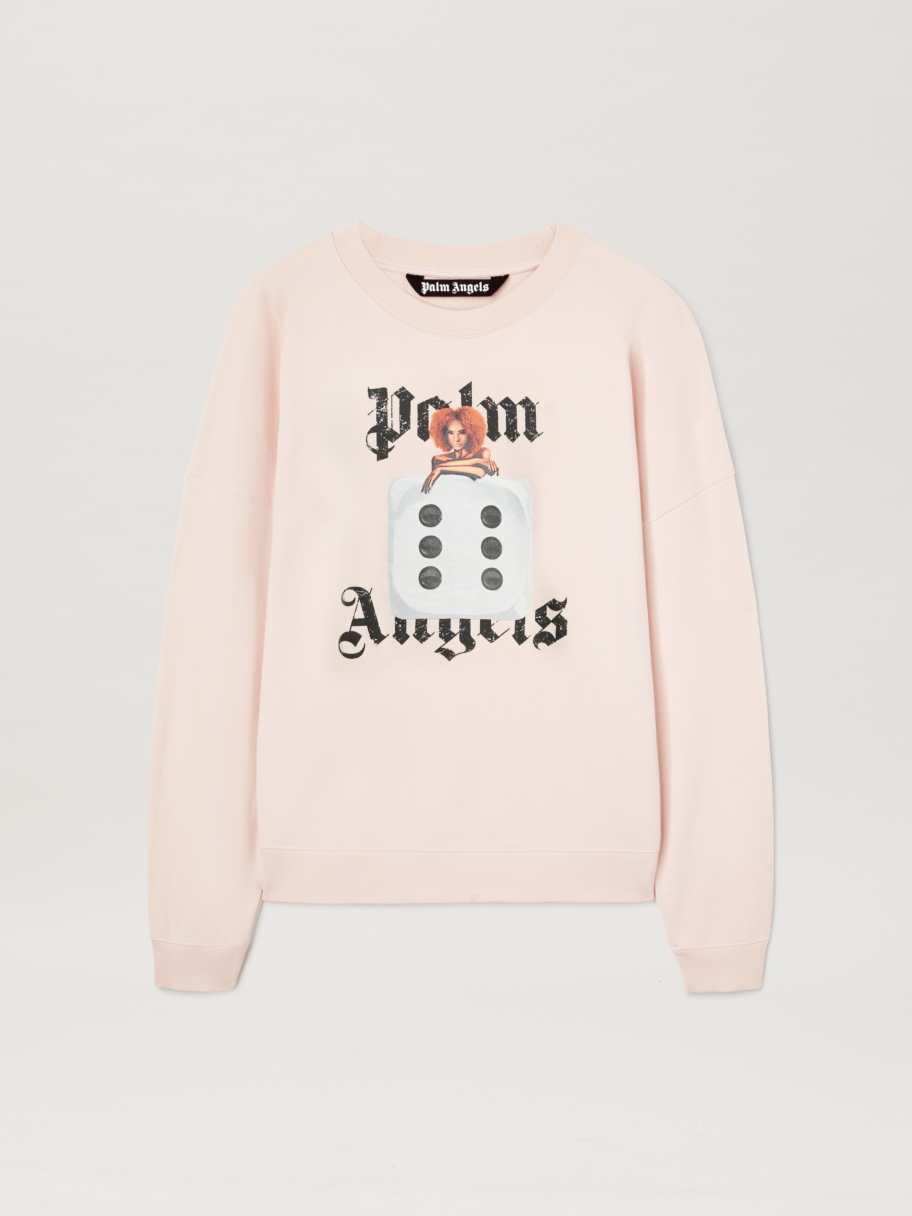 A unique original print inspired by vintage pin-ups, hybridized with elements from Palm Angels' world. Men's light pink crewneck sweatshirt with image of pinup with die and Palm Angels logo printed in black. SALAH WEARS SIZE M HEIGHT: 6' 0” (183 CM) BUST: 37.5” (95 CM) WAIST: 30” (76 CM) HIPS: 36” (91 CM) PRODUCT ID: PMBA080S25FLE0033C10