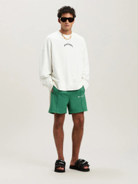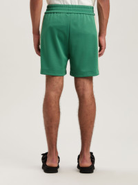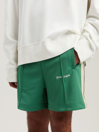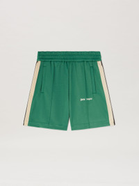 Palm Angels is a state of mind, liberating leisurewear from every convenction. Men's forest green colored track shorts with triple elastic waistband, iconic Tape on sides and Palm Angels logo embroidered in white on front. SALAH WEARS SIZE M HEIGHT: 6' 0” (183 CM) BUST: 37.5” (95 CM) WAIST: 30” (76 CM) HIPS: 36” (91 CM) PRODUCT ID: PMCL004S25FAB0015703