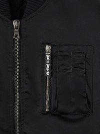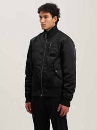 Pragmatic windbreakers with a new version of the logo. Men's glossy black bomber jacket with ribbed details, multifunction chest pocket with zipper, zipper puller with embossed logo in white and Curved logo printed in white on back. DETAILS - Salah Wears Size 48 Height: 6' 0” (183 Cm) Bust: 37.5” (95 Cm) Waist: 30” (76 Cm) Hips: 36” (91 Cm) Detail 1 100% PolyesterDetail 2 2% Elastan 98% PolyamideFabric 1 100% PolyamideFabric 2 100% Cupro - Code: PMEH033S25FAB0011010