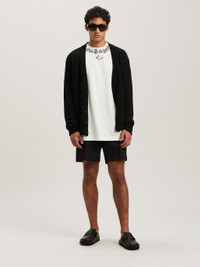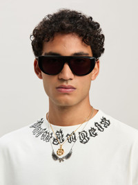 A new version of the neck logo, with gothic letters augmented with spiky flames. Men's white short-sleeved T-shirt with logo wrapped with tongues of fire printed in black on the front around the neck. SALAH WEARS SIZE M HEIGHT: 6' 0” (183 CM) BUST: 37.5” (95 CM) WAIST: 30” (76 CM) HIPS: 36” (91 CM) PRODUCT ID: PMAA001S25JER0020310