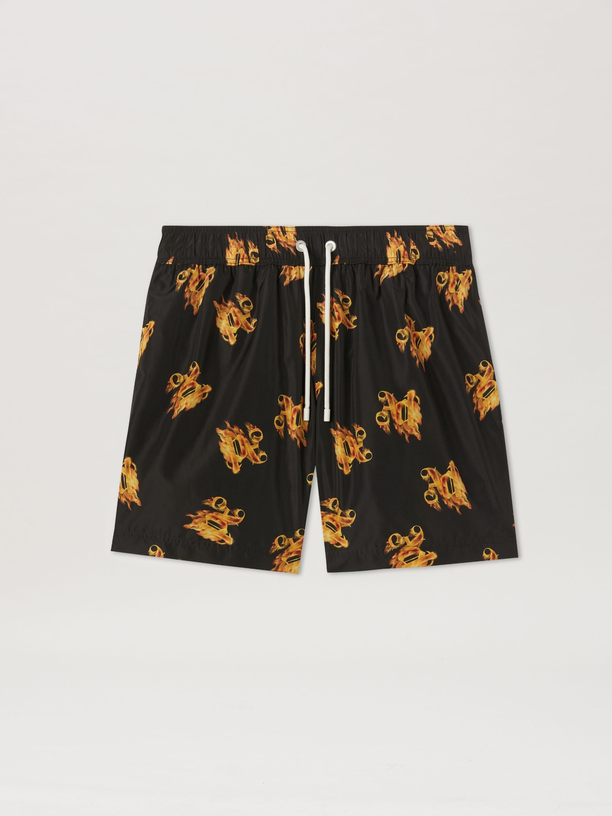 In and out water. Men's swim shorts with elastic and white drawstring waistband, featuring an all over Monogram Burning pattern with golden flames on a black background and back flap pocket. Paolo wears size M Height: 6' 2" (188 cm) Bust: 34" (86 cm) Waist: 28" (72 cm) Hips: 36" (92 cm) PRODUCT ID: PMFD002R24FAB0051076