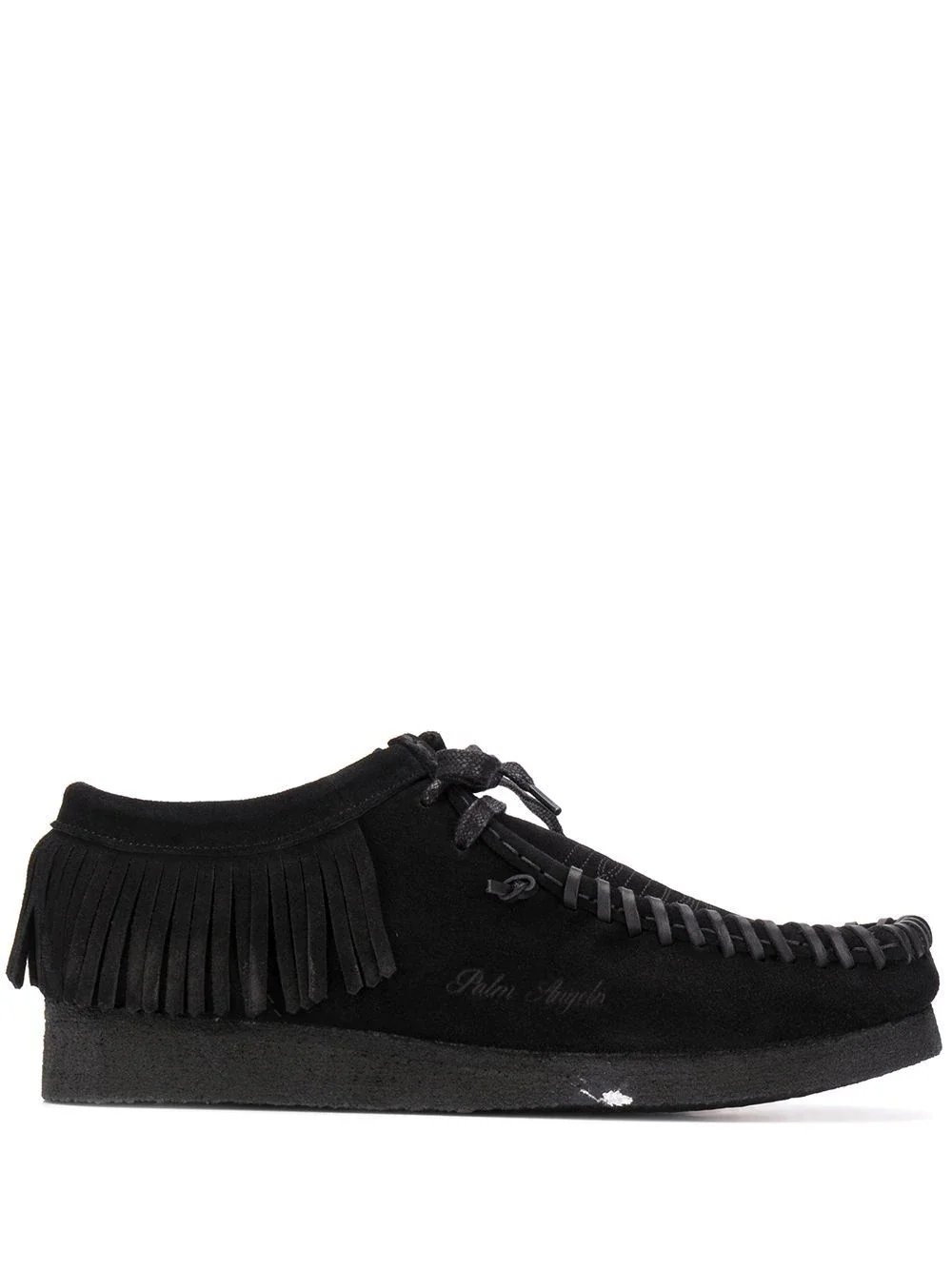 fringed lace-up shoes Add some fringing to your style. These perforated-pattern Palm Angels shoes are sure to bring in the compliments. Put your best foot forward and head out to receive the attention. Highlights - Black - Leather - Fringed edge - Tonal stitching - Perforated - Square toe - Front lace-up fastening - Rubber sole Imported Composition Lining: Cotton 100% Outer: Leather 96%, Cotton 3% Sole: Rubber 100%