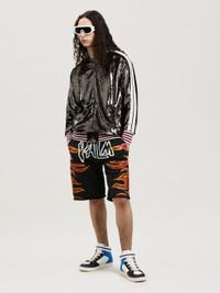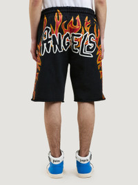 SWEATSHORTS IN GARMENT DYE BLACK COTTON WITH GRAFFITI FLAMES GRAPHIC PRINTED IN ORANGE AT FRONT AND AT BACK. "PALM ANGELS" LOGO PRINTED IN WHITE AT FRONT AND TO THE REAR. ELASTICIZED WAISTBAND FEATURING BLACK DRAWSTRINGS. SIDE AND BACK POCKETS. LOOSE FIT. FABRIC 100% COTTON MODEL RAYAN WEARS SIZE M HEIGHT: 5’11" (181 CM) CHEST: 32” (82 CM) WAIST: 27” (68 CM) HIPS: 36” (92 CM) PRODUCT ID: PMCI010F22FLE0051001