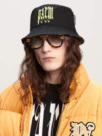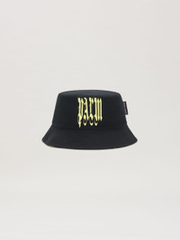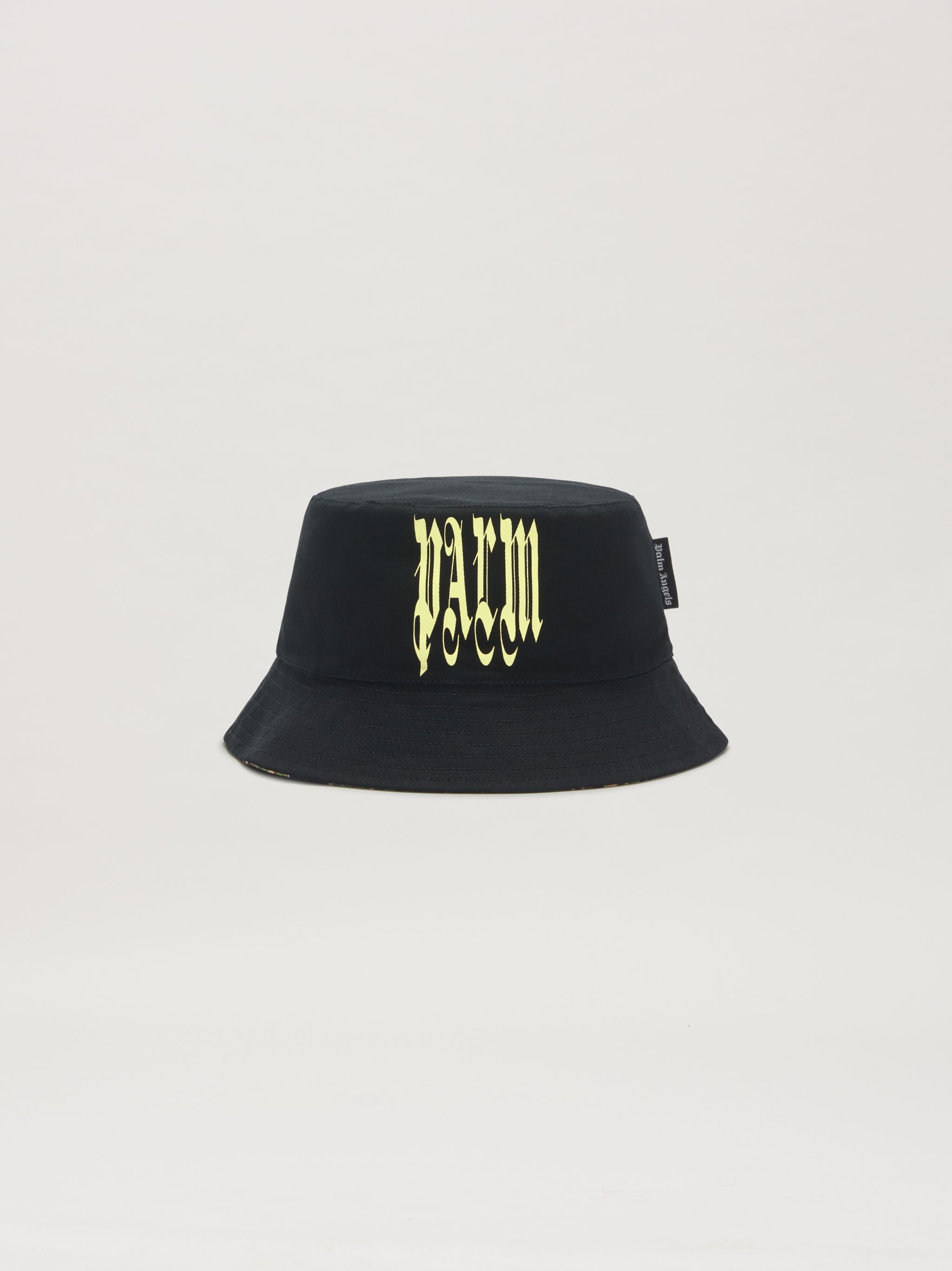 Season of logo passion, from head to toe. Men's black cotton bucket hat with gothic Palm lettering printed in lime green on front and camo internal lining. FABRIC 100% COTTON PRODUCT ID: PMLA039F24FAB0021054