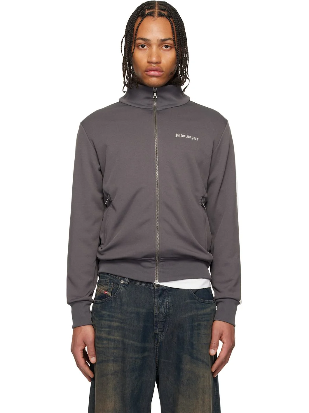Interlock jersey track jacket. · Rib-knit stand collar, hem, and cuffs · Zip closure · Logo embroidered at chest · Zip pockets · Striped knit trim at sleeves Supplier color: Dark grey/Off-white Body: 100% polyester. Trim 1: 96% polyester, 4% elastane. Trim 2: 100% polyester. Pocket lining: 100% polyester. Made in Portugal 252695M202010
