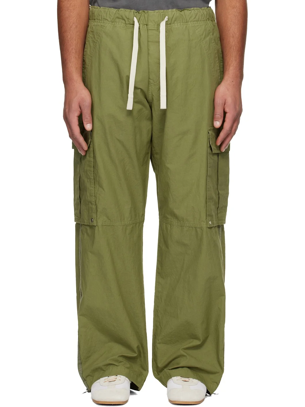 Wide-leg cotton twill cargo pants. · Drawstring at elasticized waistband · Four-pocket styling · Mock fly · Zip vent and cargo pocket at outseams · Logo printed at back pockets Supplier color: Army green/Dark green Body: 100% cotton. Pocket lining: 65% polyester, 35% cotton. Made in Italy 252695M188000