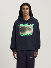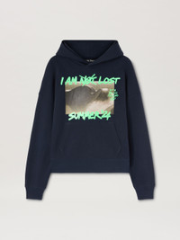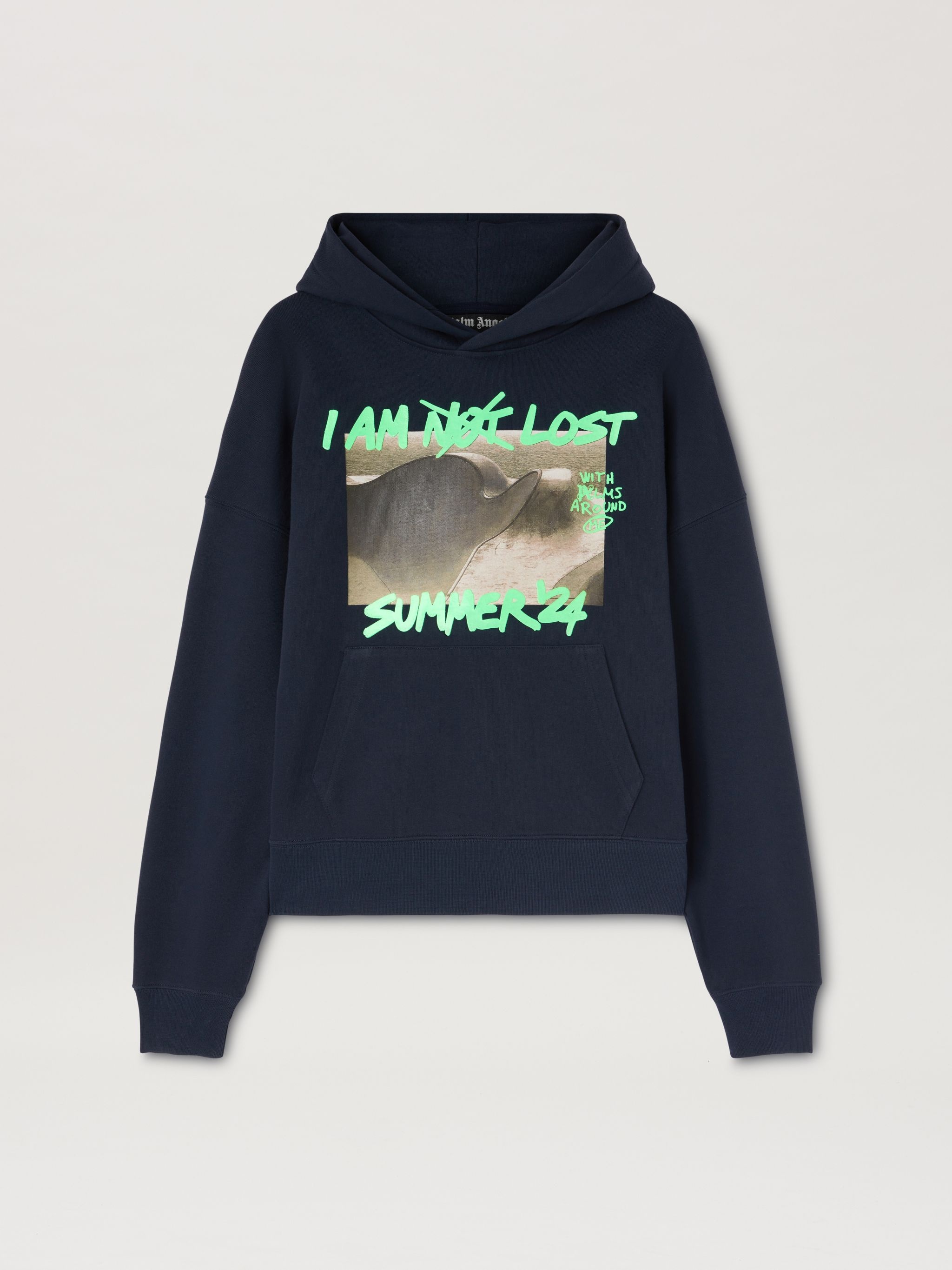 Messages and quotes that fit your personality. Men's blue hoodie with black and white photo taken from the iconic book “Palm Angels” by Francesco Ragazzi and "I am lost" lettering and message in green and Palm lettering with Monogram printed in green on the back of the hood. Mohamed wears size M Height: 6' 1"" (185 cm) Bust: 34"" (86 cm) Waist: 28"" (71 cm) Hips: 37"" (94 cm) PRODUCT ID: PMBB058S24FLE0034670