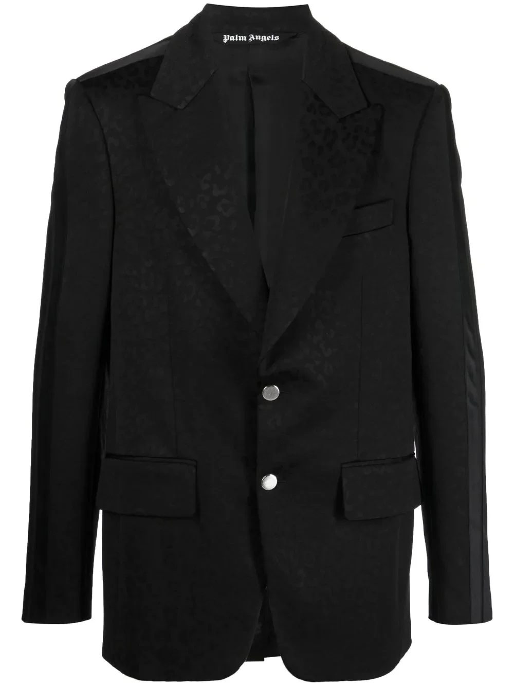 jacquard single-breasted blazer Made in Italy, this black blazer from Palm Angels is given a bold yet relaxed look thanks to its tonal leopard jacquard throughout. Cut for a tailored fit, this piece is elevated with peak lapels. Made in Italy Composition Outer: Polyamide 50%, Viscose 47%, Spandex/Elastane 3% Lining: Cupro 100%, Cotton 100% SIZE & FIT Model measurements Height 6 ft 2 in(1.87 m) Bust/Chest 35.82 in(91 cm) Hips 35.43 in(90 cm) Waist 27.95 in(71 cm) FittingInformation This piece fits true to size. We recommend you get your regular size Cut for a loose fit Made with a mid-weight fabric Washing instructions Machine Wash