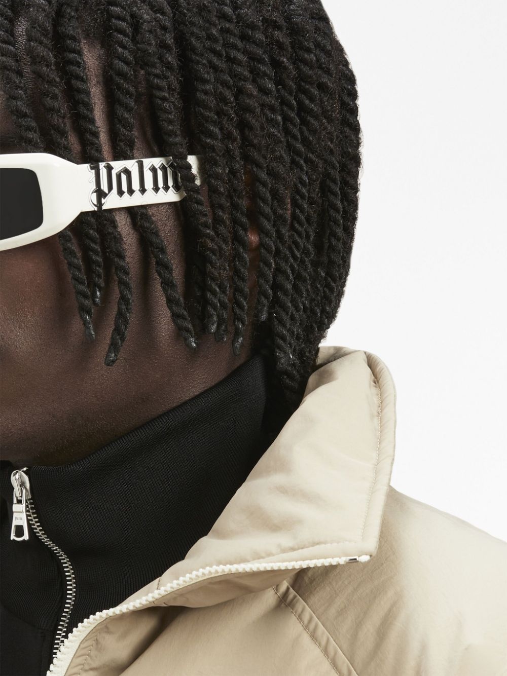 Kerman logo-print sunglasses Palm Angel's Kerman sunglasses are designed with a rectangular frame and contrasting dark grey tinted lenses. The brand's recognisable gothic logo script adorns the arm. Highlights - White - Grey tinted lenses - Rectangle frame - Straight arms - Logo print to the side - Curved tips Made in Italy Composition Acetate 80%, Metal 20%