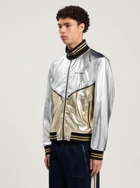 Reflective metallic track jacket with laminated coating featuring ribbed trims and a sleek silhouette. - High-shine laminated finish - Full front zip fastening - Long sleeves with ribbed cuffs - Striped ribbed collar and hem - Signature logo detail on chest DETAILS - 78% Polyester 22% Polyurethane, Lining: 100% Cupro, Rib detail: 96% Polyester 4% Elastan - Code: PMJA046F25FAB0017276