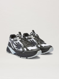 Streamlined imprinting and subtle details for the new version of the PA 4 runner. White leather running sneaker with light grey inserts, cushioned sole and elongated black palm stitched on sides. PRODUCT ID: PMIA102F24LEA0020510