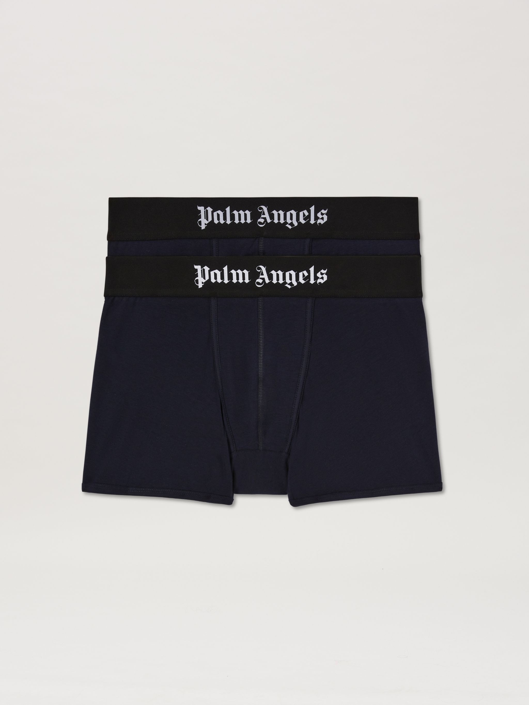 An exposed logo band to match your favourite styles. Pack of two men's blue boxer with black elastic band with Palm Angels logo in white. PRODUCT ID: PMUH003S25FAB0014610