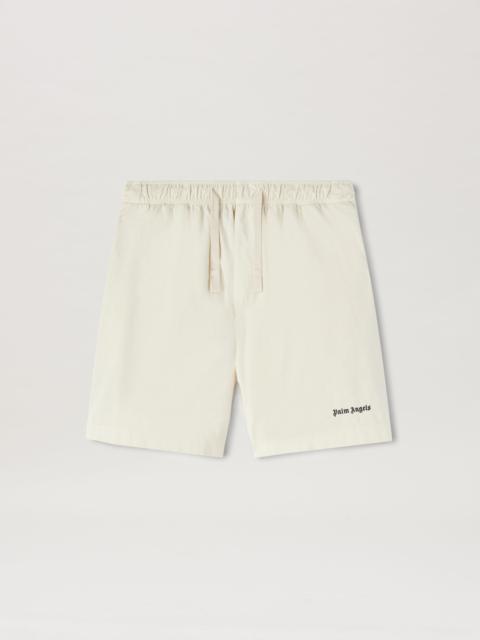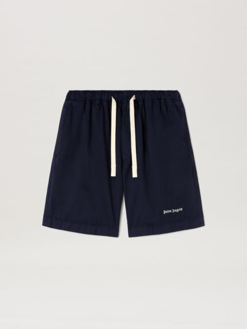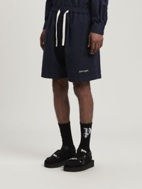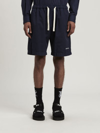 Simple yet distinctive, perfect for sport or lounge. Men's blue bermuda shorts with elastic and drawstring waistband, back pocket and white printed logo on left leg. Mohamed wears size 48 Height: 6' 1"" (185 cm) Bust: 34"" (86 cm) Waist: 28"" (71 cm) Hips: 37"" (94 cm) PRODUCT ID: PMCB051S24FAB0034603