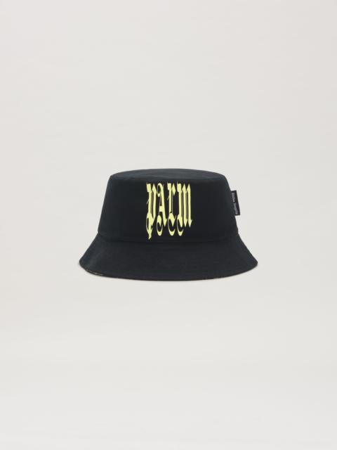 Season of logo passion, from head to toe. Men's black cotton bucket hat with Palm Angels logo printed in white on front. FABRIC 100% COTTON PRODUCT ID: PMLA039F24FAB0011003