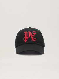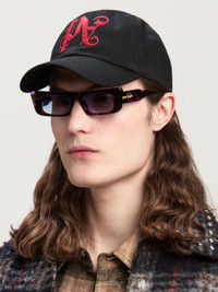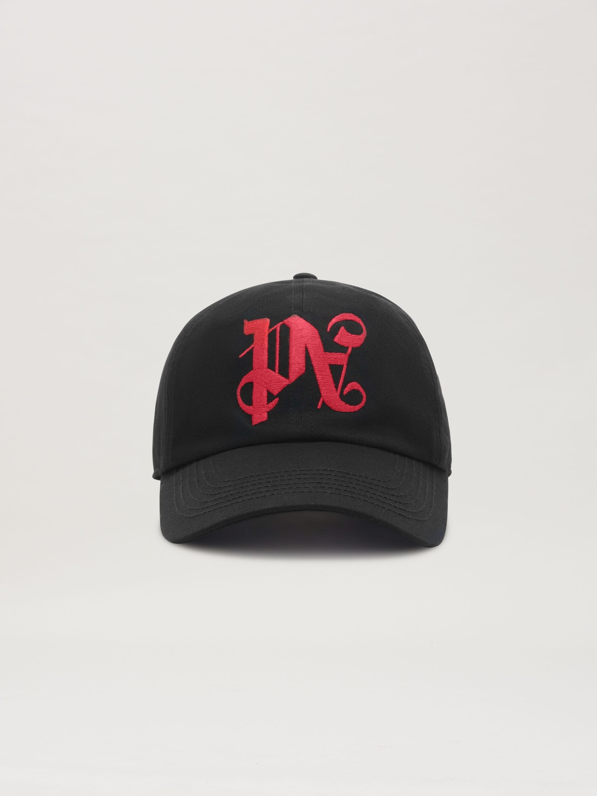 Styling one's outfit from the top. Men's black baseball cap with maxi dark red Monogram fully embroidered on front. PRODUCT ID: PMLB104F24FAB0041026