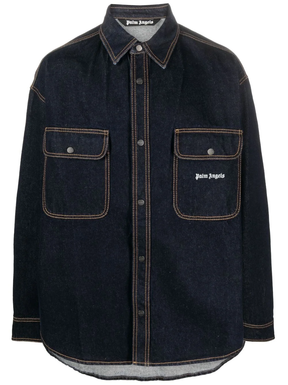 logo-embroidered denim shirt Boasting Palm Angels' effortlessly relaxed aesthetic, this navy-blue denim shirt is adorned with the brand's contrasting white logo embroidered at the chest patch pocket for a branded touch. Highlights - Navy blue - Cotton - Denim - Contrast stitching - Pointed flat collar - Embroidered logo at the chest - Front press-stud fastening - Long sleeves - Buttoned cuffs - Two chest flap pockets - Rear curved hem Made in Italy Composition Cotton 100%, Polyester 100% SIZE & FIT Model measurements Height 6 ft 2 in(1.87 m) Bust/Chest 36.41 in(92.5 cm) Hips 35.43 in(90 cm) Waist 29.52 in(75 cm) Measurement CHEST 47.99 in(121.9 cm) SLEEVE LENGTH 23.5 in(59.7 cm) LENGTH 28.5 in(72.4 cm) WAIST 50.98 in(129.5 cm) FittingInformation Designed to be unstructured, offering a loose fit throughout Sturdy and hard-wearing, this denim piece offers no stretch This piece fits true to size – take your usual size Washing instructions Machine Wash