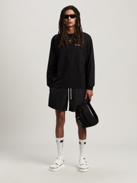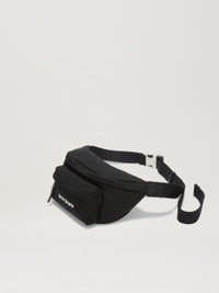 Blurring the boundaries between utility bags and statement accessories. Men's black fanny pack with zippered front pocket, adjustable belt with snap buckle and white printed logo on front. Made in Italy. Width:30cm Height:16,5cm Depth:14cm Weight:410 gr PRODUCT ID: PMNO009S24FAB0011001