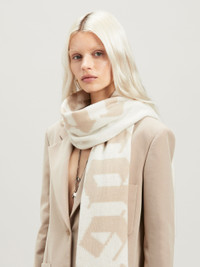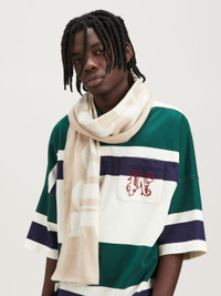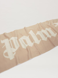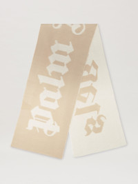 Men's pink knit scarf with, exclusive new feature for the fall winter 2023 collection, Palm Angels logo in white jacquard. FABRIC 50% WOOL 50% ACRYLIC PRODUCT ID: PMMA025F23KNI0016103