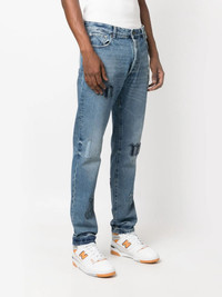 PALM ANGELS MEN logo-patch straight jeans Palm Angels infuses these jeans with branding motifs, thanks to the multiple monogram patches on the front. They're cut from light-wash cotton denim to a straight-leg silhouette and stitched with a natural leather patch at the back. Highlights light blue cotton straight leg patch detail logo patch to the rear mid-rise belt loops front button fastening classic five pockets Composition Outer: Cotton 100%, Leather 100% Lining: Cotton 100% Washing instructions Hand Wash Wearing The model is 1.88 m.