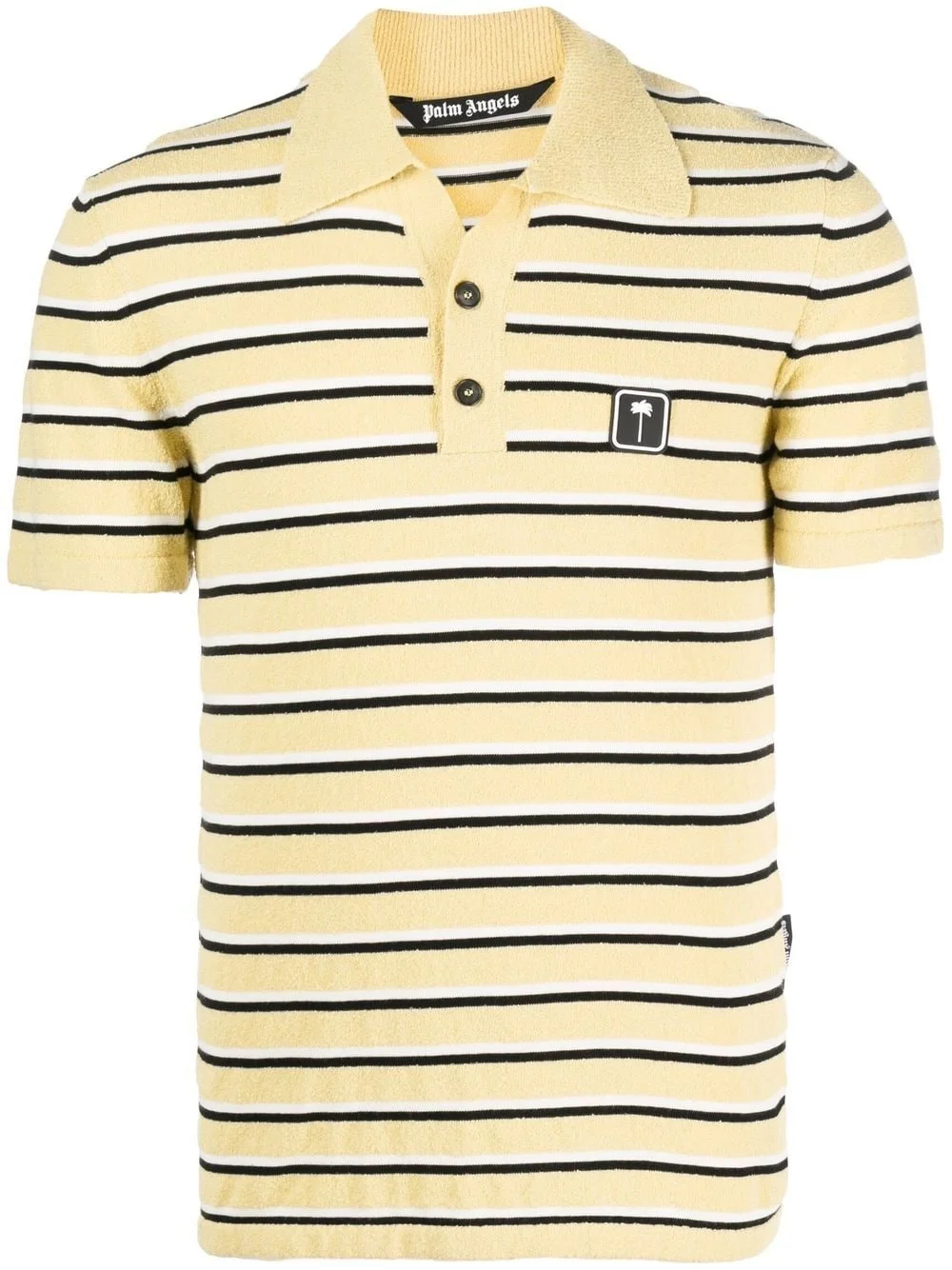 logo-patch striped terry polo shirt Palm Angels revisits the classic polo shirt style. Maintaining a chest logo patch and a striped pattern for a classic look, the style is updated with a soft terry construction. Made in Italy Composition Polyester 100%, Cotton 70%, Polyamide 30% SIZE & FIT Model measurements Height 6 ft 0 in(1.84 m) Bust/Chest 36.22 in(92 cm) Hips 35.43 in(90 cm) Waist 26.77 in(68 cm) FittingInformation This piece fits true to size. We recommend you get your regular size Cut for a slim fit Made with a mid-weight fabric Washing instructions Hand Wash