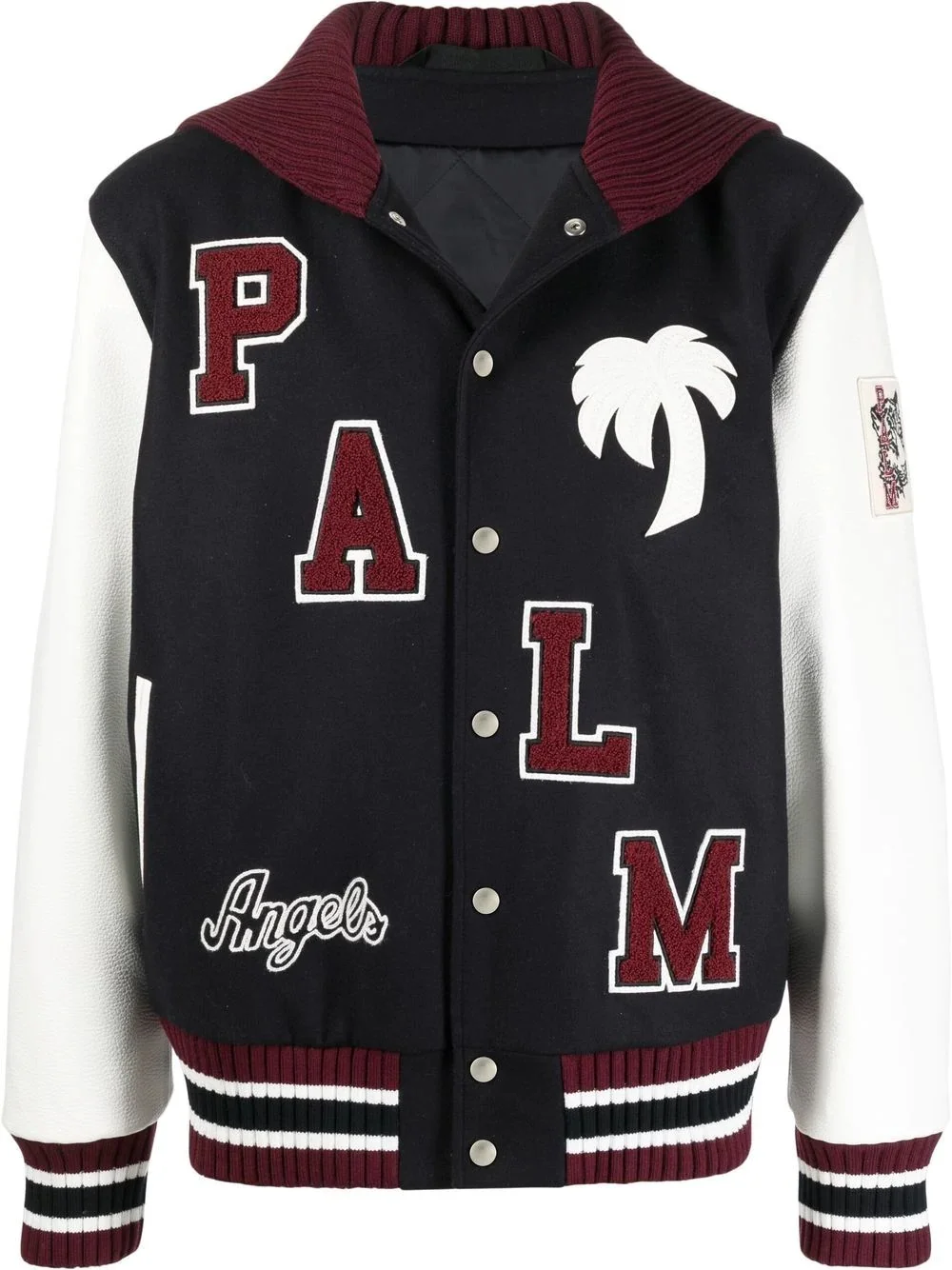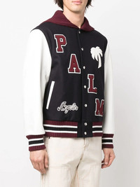 logo-patch varsity jacket Palm Angels puts its LA spin on the classic varsity jacket for SS22. This colourful iteration is detailed with logo lettering and contrasting striped trims. Made in Italy Composition Polyester 100%, Leather 100%, Virgin Wool 75%, Acrylic 50%, Cotton 50%, Polyamide 20%, Cashmere 5% SIZE & FIT Model measurements Height 6 ft 2 in(1.89 m) Bust/Chest 37.79 in(96 cm) Hips 37 in(94 cm) Waist 29.92 in(76 cm) FittingInformation This piece fits true to size. We recommend you get your regular size Cut for a loose fit Made with a mid-weight non-stretch fabric Washing instructions Specialist Cleaning