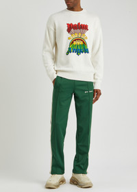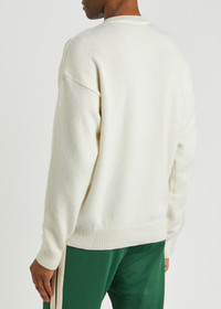 INFO & CARE - Palm Angels wool-blend jumper - Crew-neck, printed front, dropped shoulders, designer tag at side, ribbed trims - Slips on - 40% extrafine merino wool, 30% viscose, 20% polyamide, 10% cashmere - Hand wash SIZE & FIT - Length shoulder to hem: 27.5 inches/ 70cm - Midweight - Relaxed fit - Model is 6'3"/ 191cm, chest size 38 inches and wears a size medium