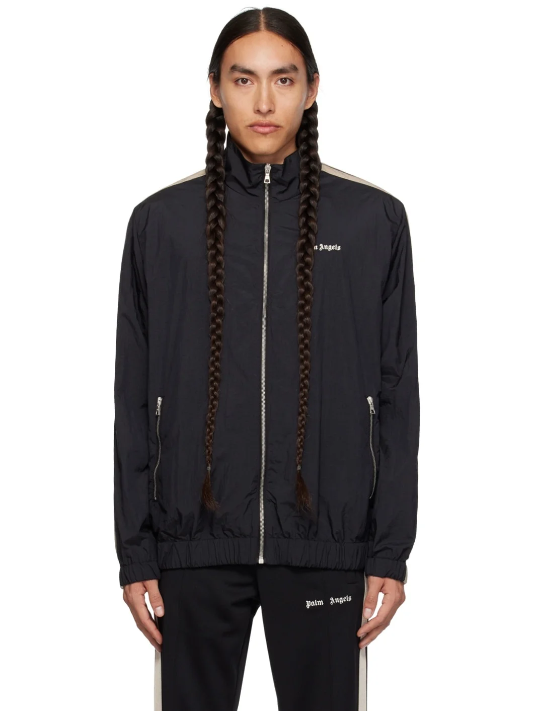 Nylon taffeta track jacket. · Stand collar · Zip closure · Logo embroidered at chest · Zip pockets · Elasticized hem and cuffs · Striped trim at sleeves · Logo-engraved silver-tone hardware Supplier color: Black