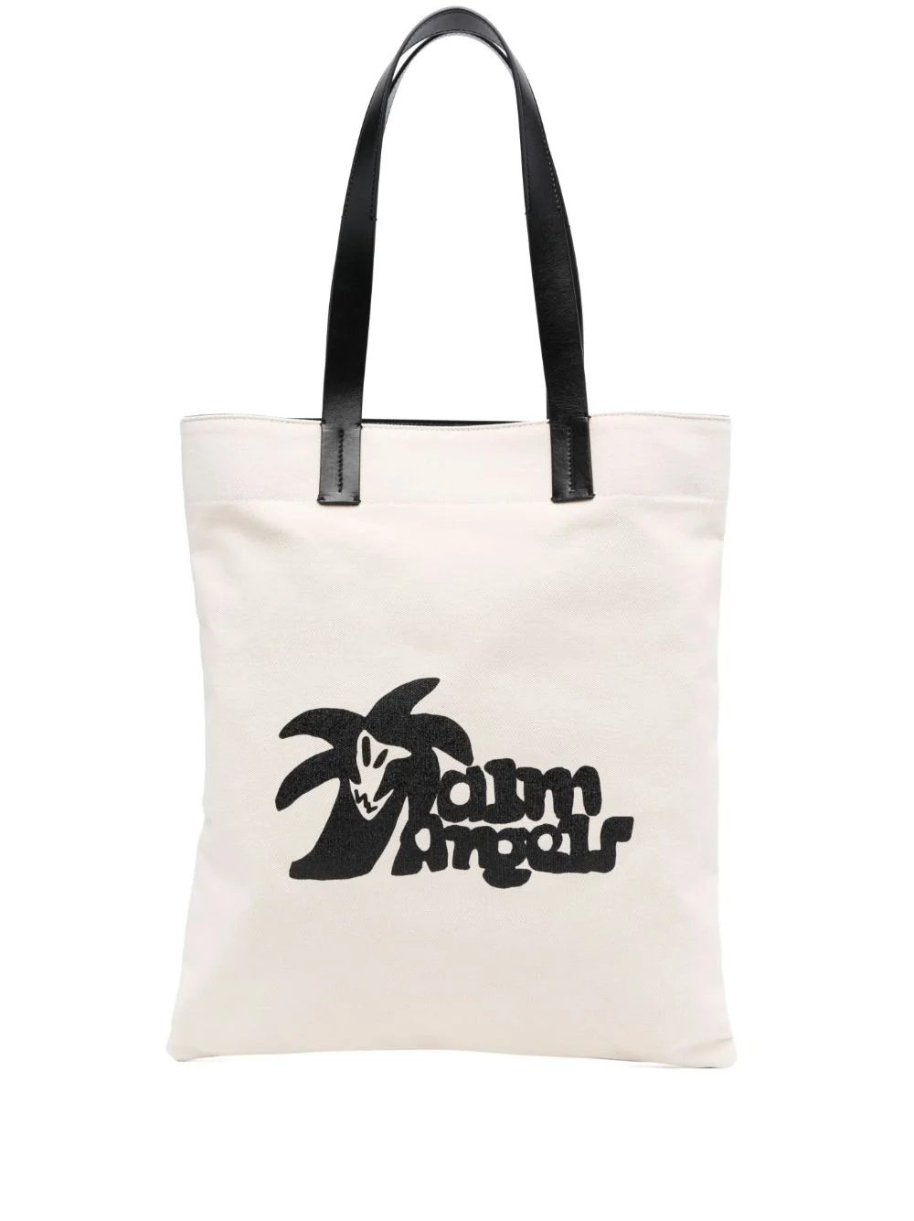 logo-print canvas tote bag Spotlighting Palm Angels' Californian inspirations and irreverent spirit, this canvas tote bag is printed with psychedelic smiling palm trees – the one at the front melts into the logo. Highlights - White/black - Canvas - Logo print to the front - Graphic print to the rear - Open top - Leather top handles - Internal logo patch - Internal slip pocket Made in Italy Composition Outer: Calf Leather 100%, Fabric 100% SIZE & FIT Model measurements Height 6 ft 1 in(1.85 m) Bust/Chest 35.43 in(90 cm) Hips 35.82 in(91 cm) Waist 27.55 in(70 cm) Measurement DEPTH 1.18 in(3 cm) HANDLE 9.84 in(25 cm) HEIGHT 15.74 in(40 cm) WIDTH 13.77 in(35 cm)