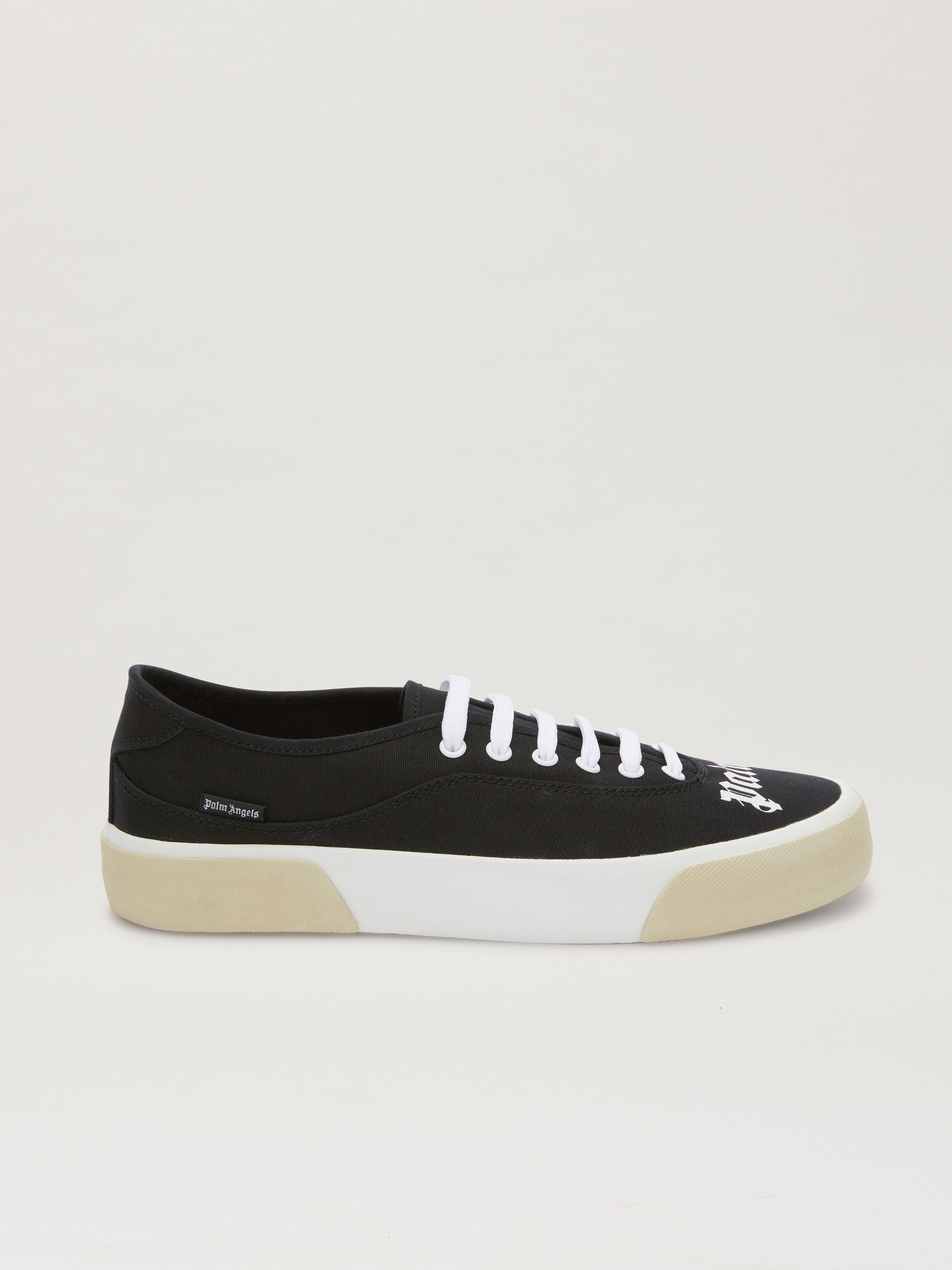 LOW-TOP SNEAKERS IN BLACK FEATURING A WHITE "PALM ANGELS" LOGO AT FRONT. WHITE AND OFF WHITE RUBBER SOLE. WHITE LACE-UP CLOSURE. LINING 100% COTTON - SOLE 100% RUBBER - UPPER SHOE 100% COTTON PRODUCT ID: PMIN001S23FAB0011001