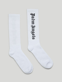 High socks in white. Vertical "Palm Angels" logo knitted in black at side legs. PRODUCT ID: PMRA001C99FAB0020110