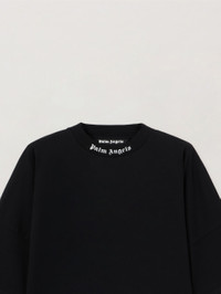 SHORTS SLEEVES T-SHIRT IN BLACK COTTON WITH "PALM ANGELS" LOGO PRINTED IN WHITE AT COLLAR AND AT BACK. CREWNECK COLLAR. OVERSIZE FIT. PRINT EXECUTED ON FINISHED GARMENT. THIS PARTICULAR PROCEDURE MAKES EACH GARMENT LOOKS DIFFERENT, THE PRINT IS IRREGULAR, ESPECIALLY NEAR THICKER AREAS WHERE THERE MAY BE FRAGMENTATION OR COLOUR BUILD UP. THESE DISTINGUISHING FEATURES ARE AN EFFECT THAT MAKE THIS GARMENT UNIQUE AND ARE NOT TO BE CONSIDERED FLAWS. THESE ASPECTS MAY CHANGE WITH GARMENT USE AND HANDLING. FABRIC 100% COTTON - RIB DETAIL 100% COTTON MODEL PAOLO WEARS SIZE M HEIGHT: 6'2 (187 CM) CHEST: 32" (82 CM) WAIST: 27" (68 CM) HIPS: 36" (91 CM) PRODUCT ID: PMAA002C99JER0011001