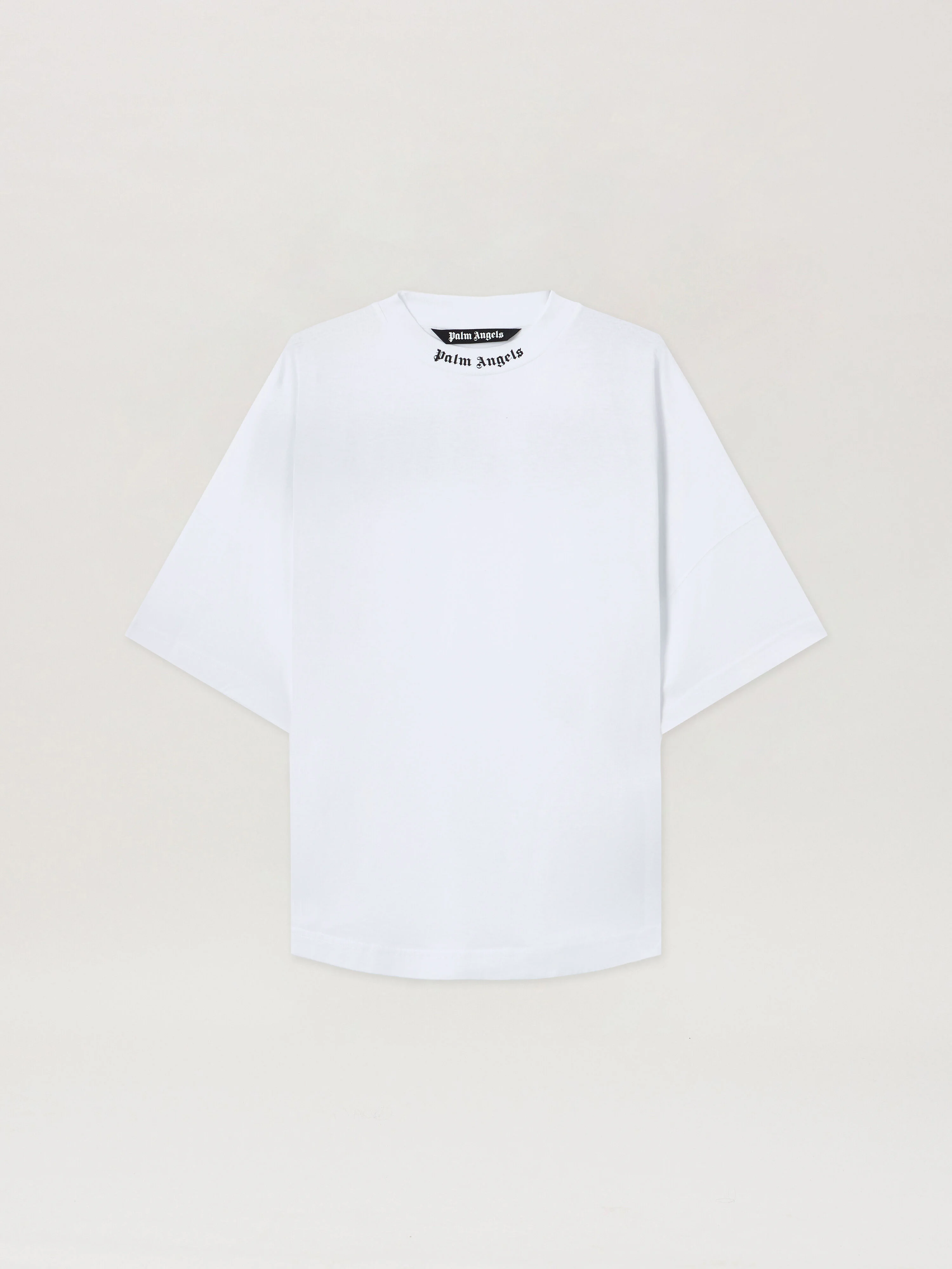 A clean cut with bold identity. This oversized white t-shirt features the palm angels gothic logo at the collar, a streetwear essential with attitude. DETAILS - FABRIC 100% COTTON - RIB DETAIL 100% COTTON - Code: PMAA002C99JER0010110