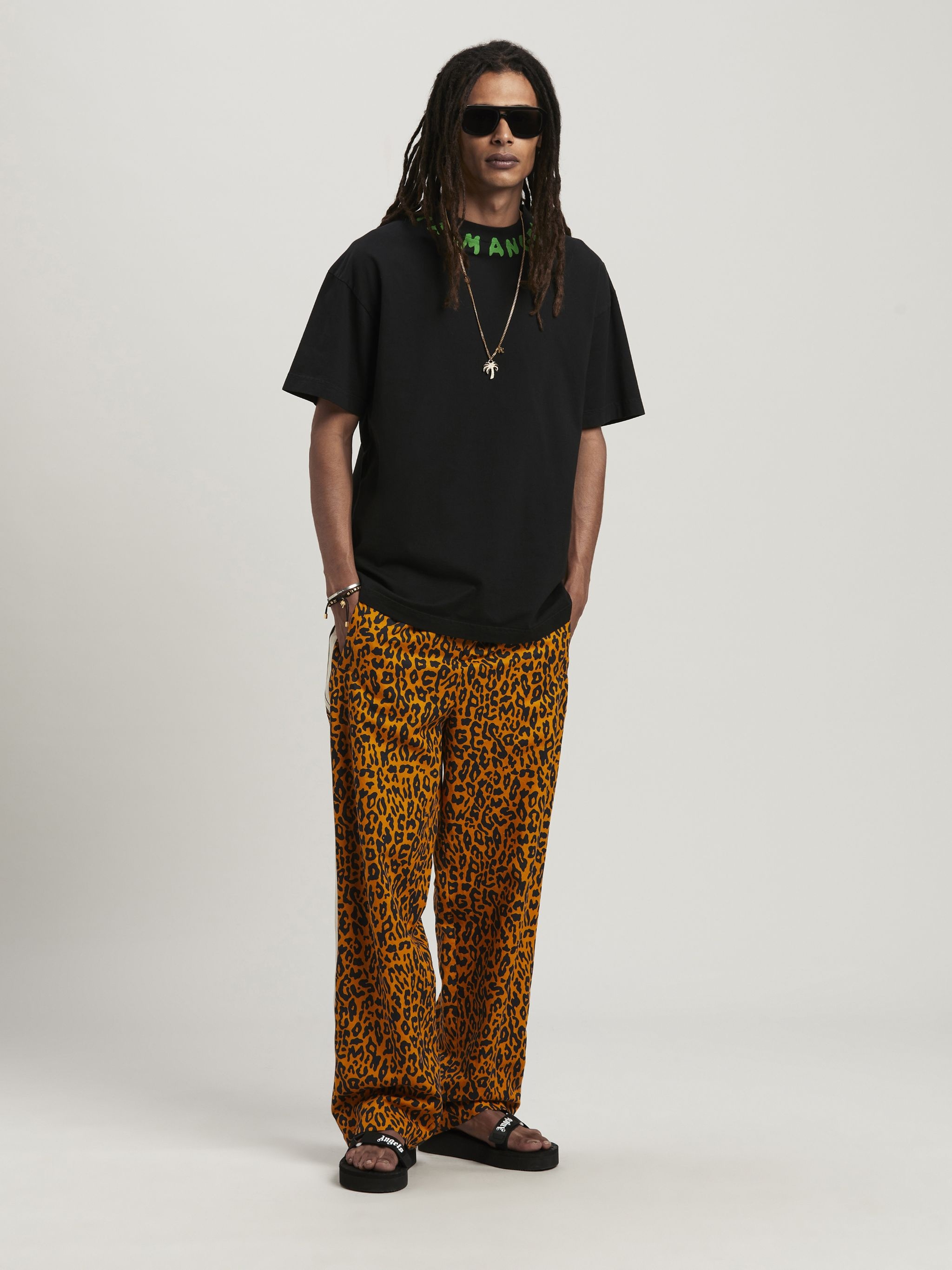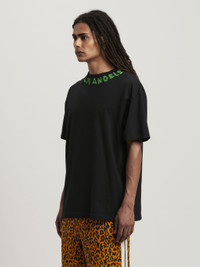 An original version of the Palm Angels logo as a distinctive feature of the SS24 season. Men's black T-shirt with new Palm Angels lettering collection, printed in green around the collar. Mohamed wears size M Height: 6' 1"" (185 cm) Bust: 34"" (86 cm) Waist: 28"" (71 cm) Hips: 37"" (94 cm) PRODUCT ID: PMAA072S24JER0021070