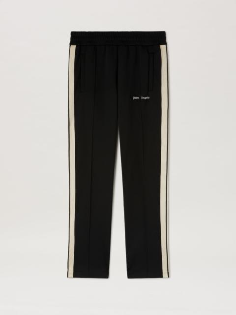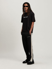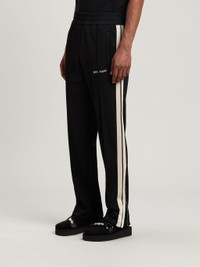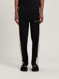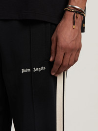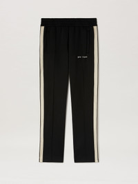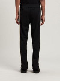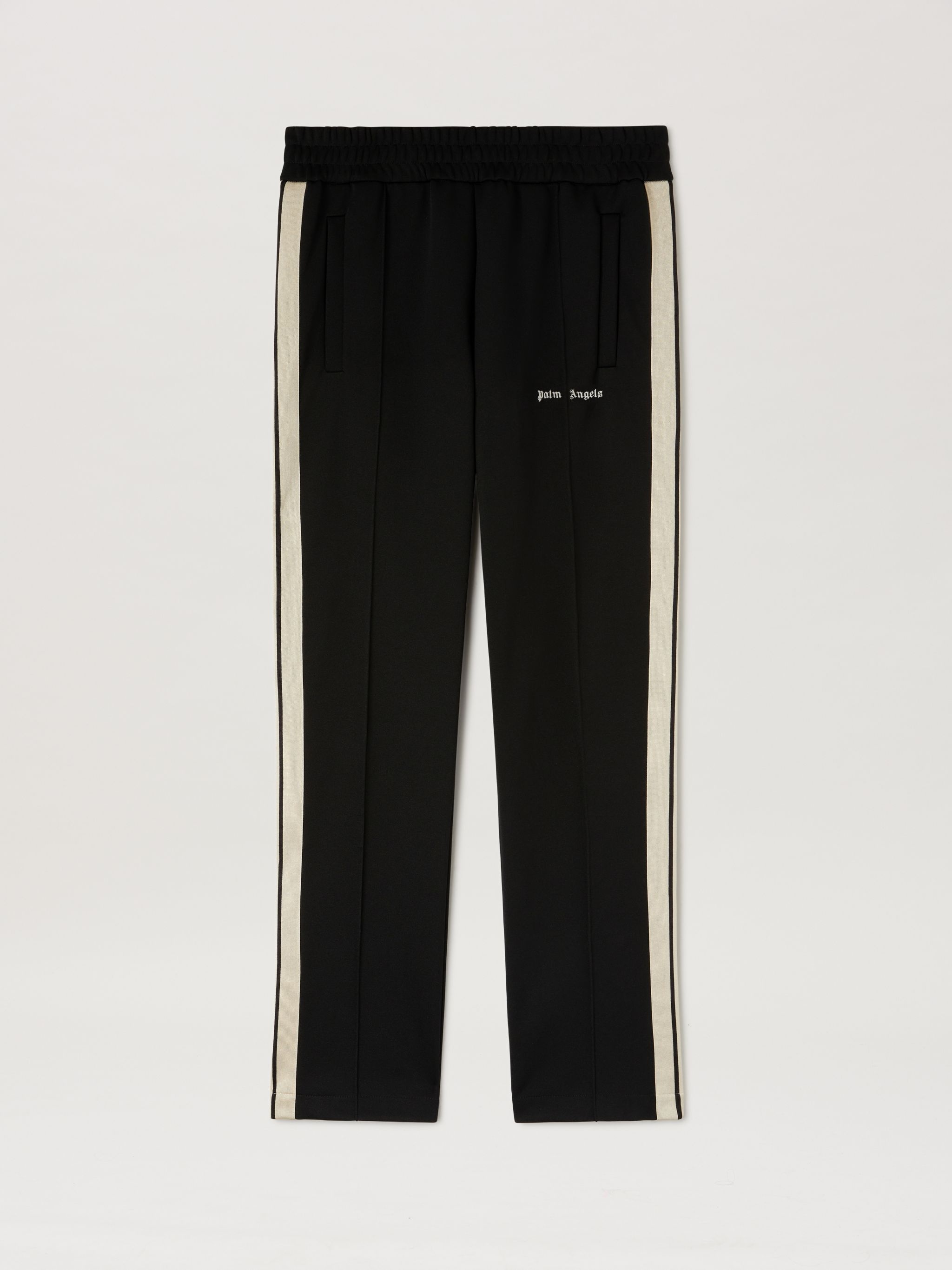 Widening the angle, adopting light and uncoventional fabrics, new cuts, embroideries and prints to reinvent our iconic piece. Men's black tracksuit pants with elastic waistband, ecru side bands and vertical pockets, ankle zippers and white embroidered logo in front. Mohamed wears size M Height: 6' 1"" (185 cm) Bust: 34"" (86 cm) Waist: 28"" (71 cm) Hips: 37"" (94 cm) PRODUCT ID: PMCJ020S24FAB0011003