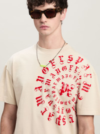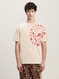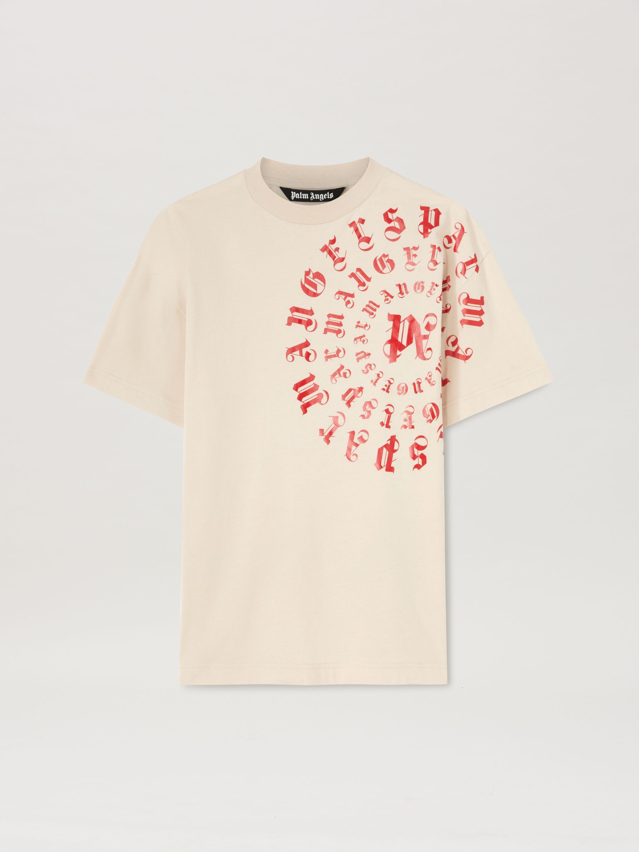 Vertigo: a completely new spiral logo pattern. Men's light beige short-sleeved T-shirt with new vortex lettering printed off-center in red, featuring Mongram PA in the center surrounded by concentric Palm Angels logo. FABRIC 100% COTTON - RIB DETAIL 100% COTTON WILL WEARS SIZE M HEIGHT: 6' 2" (189 CM) BUST: 35" (88 CM) WAIST: 28" (71 CM) HIPS: 35" (90 CM) PRODUCT ID: PMAA001F24JER0016125