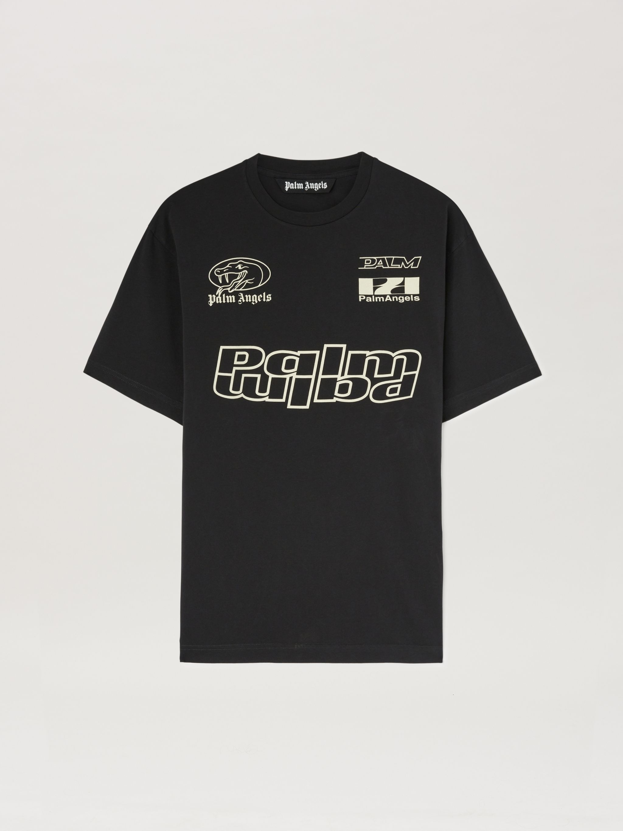 Wisdom, charm, elegance and transformation. Enjoy the Year of the Snake with dedicated graphics and unique pieces. Black men's short-sleeved T-shirt with image of snake, double Palm lettering and dedicated Lunar New Year graphics printed in white on front. PRODUCT ID: PMAA089G25JER0011003