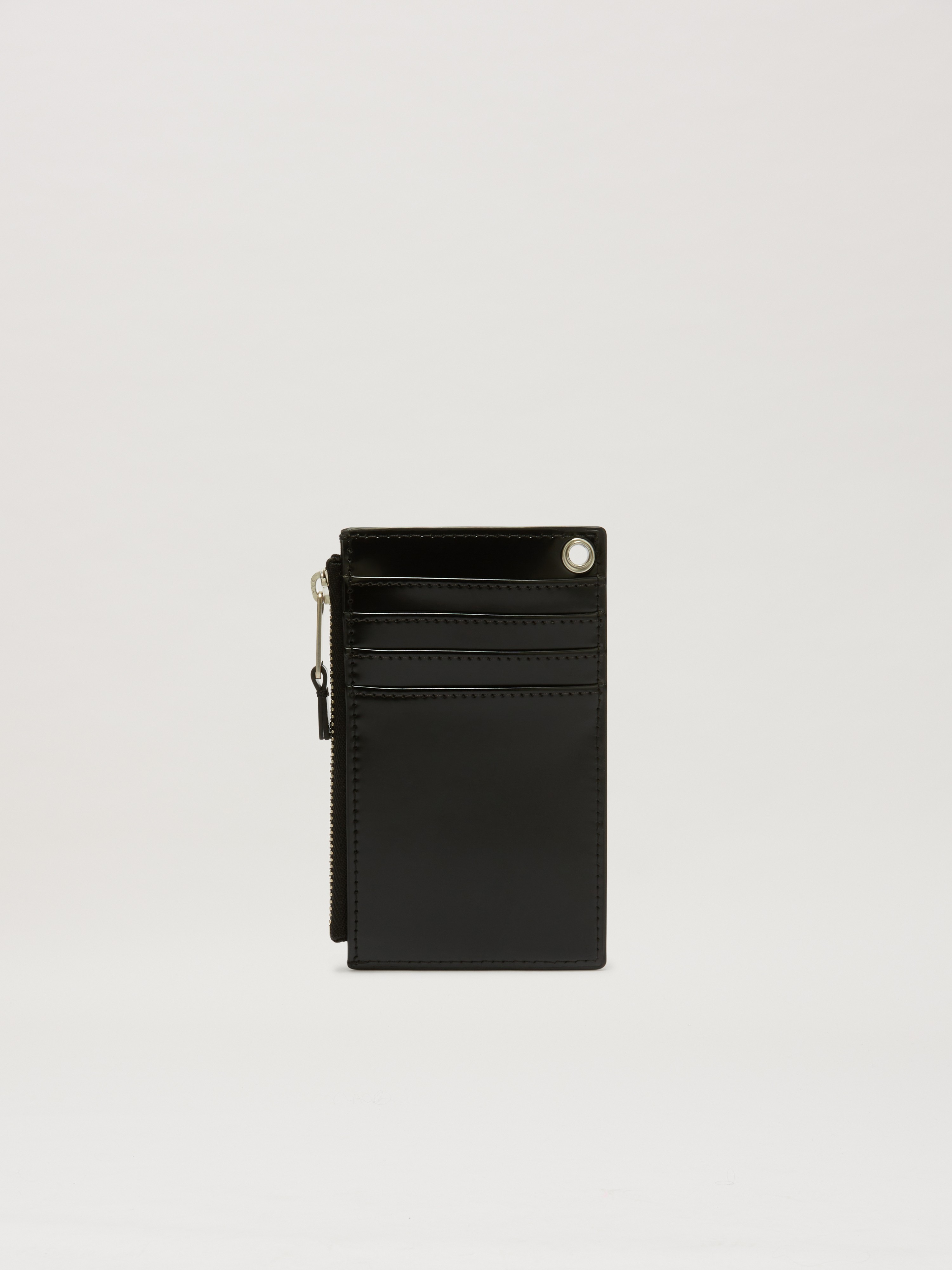To stand out without being showy. Men's shiny black leather card holder with metal chain and logo plate, and tone on tone Curved logo debossed on front. HEIGHT: 12 CM WIDTH: 7,5 CM WEIGHT: 45 GR PRODUCT ID: PMND01AS25FAB0011000