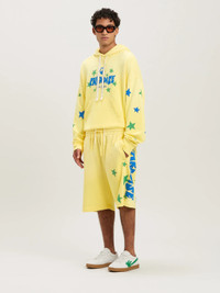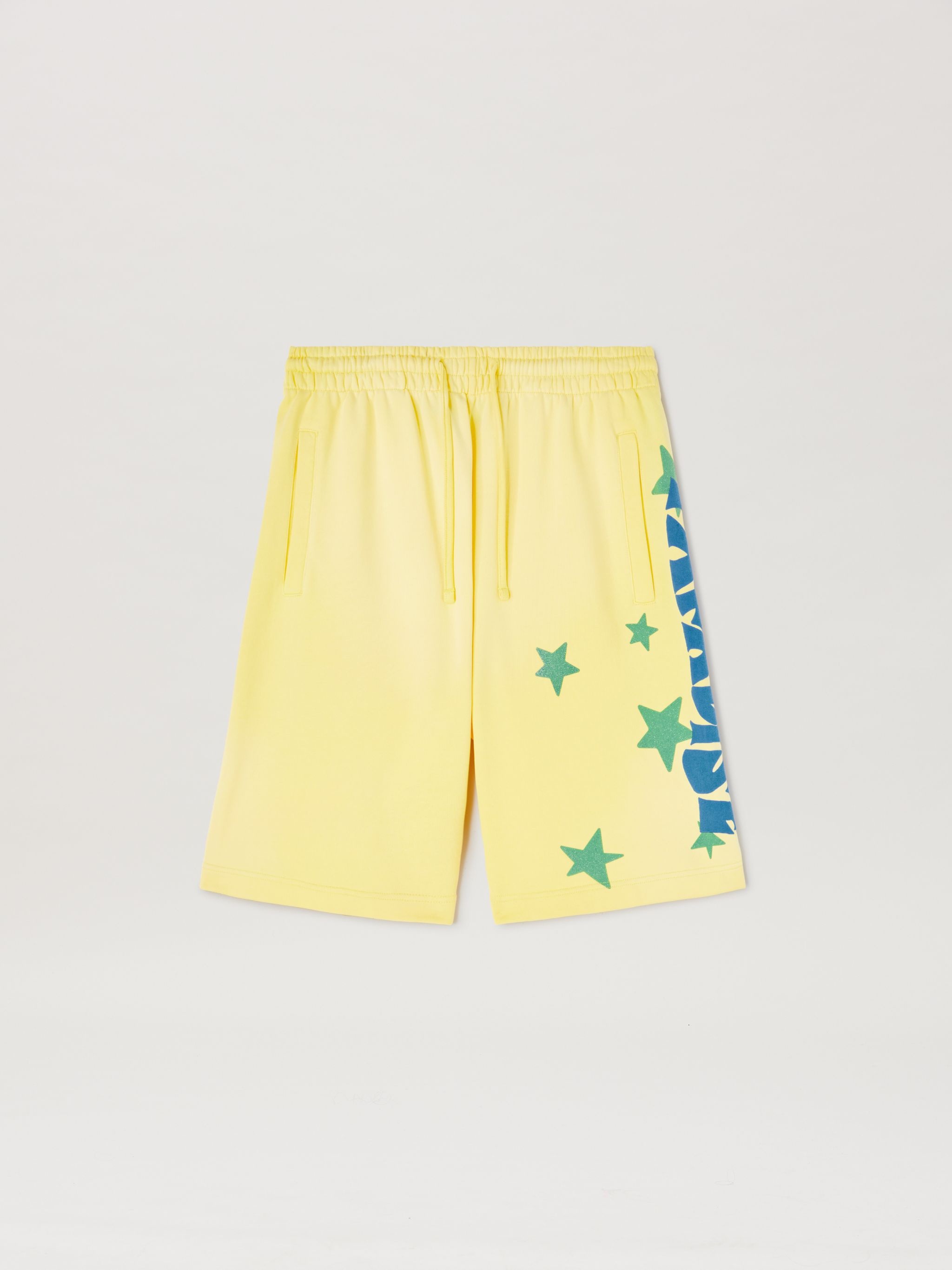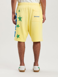 Tropical graphics, glitter details, 3D effects: one of the exclusive prints of SS25. Men's yellow sweat shorts with drawstring waistband and Paradise lettering printed in light blue on left leg, glittering green stars printed on front and back and Palm Angels logo in light blue embroidered (???) on back pocket. SALAH WEARS SIZE M HEIGHT: 6' 0” (183 CM) BUST: 37.5” (95 CM) WAIST: 30” (76 CM) HIPS: 36” (91 CM) PRODUCT ID: PMCI027S25FLE0011845