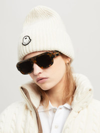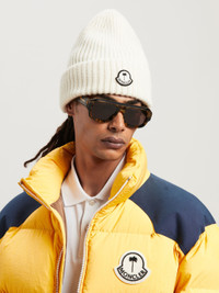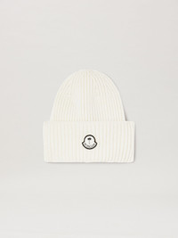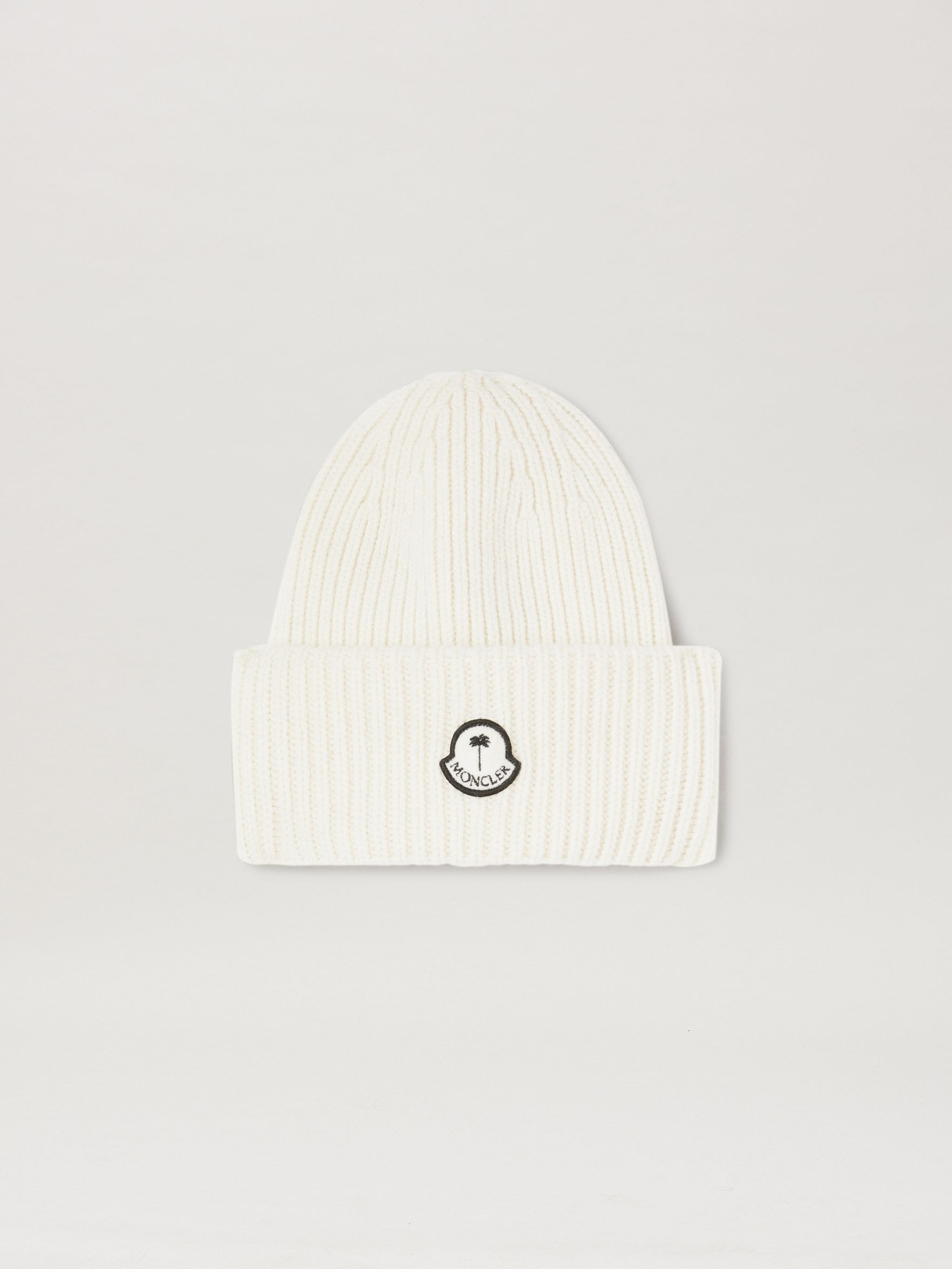 Moncler Genius Palm Angels special collection, limited edition. Ribbed white wool turn up beanie with Moncler X Palm Angels velvet logo on front. PRODUCT ID: PMLC031T24KNI0010100